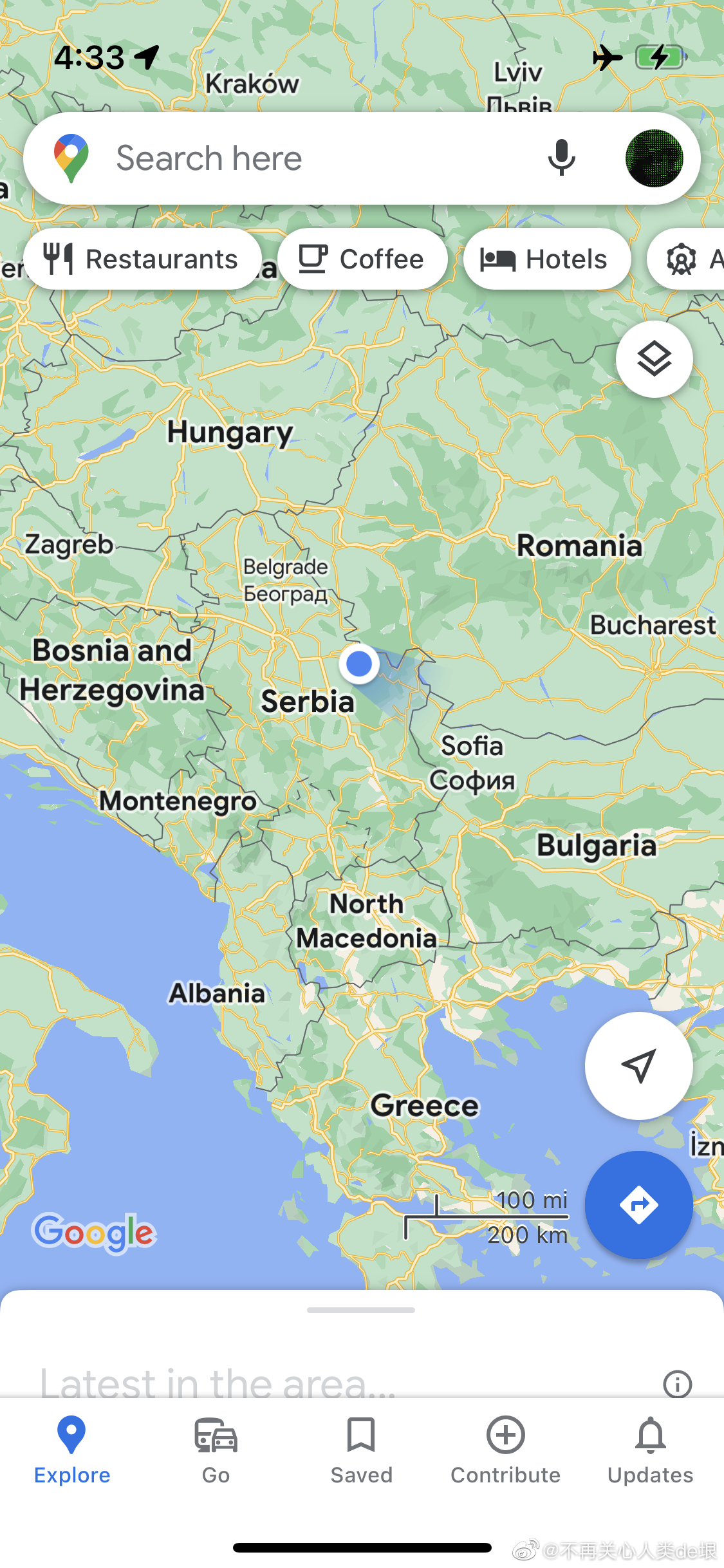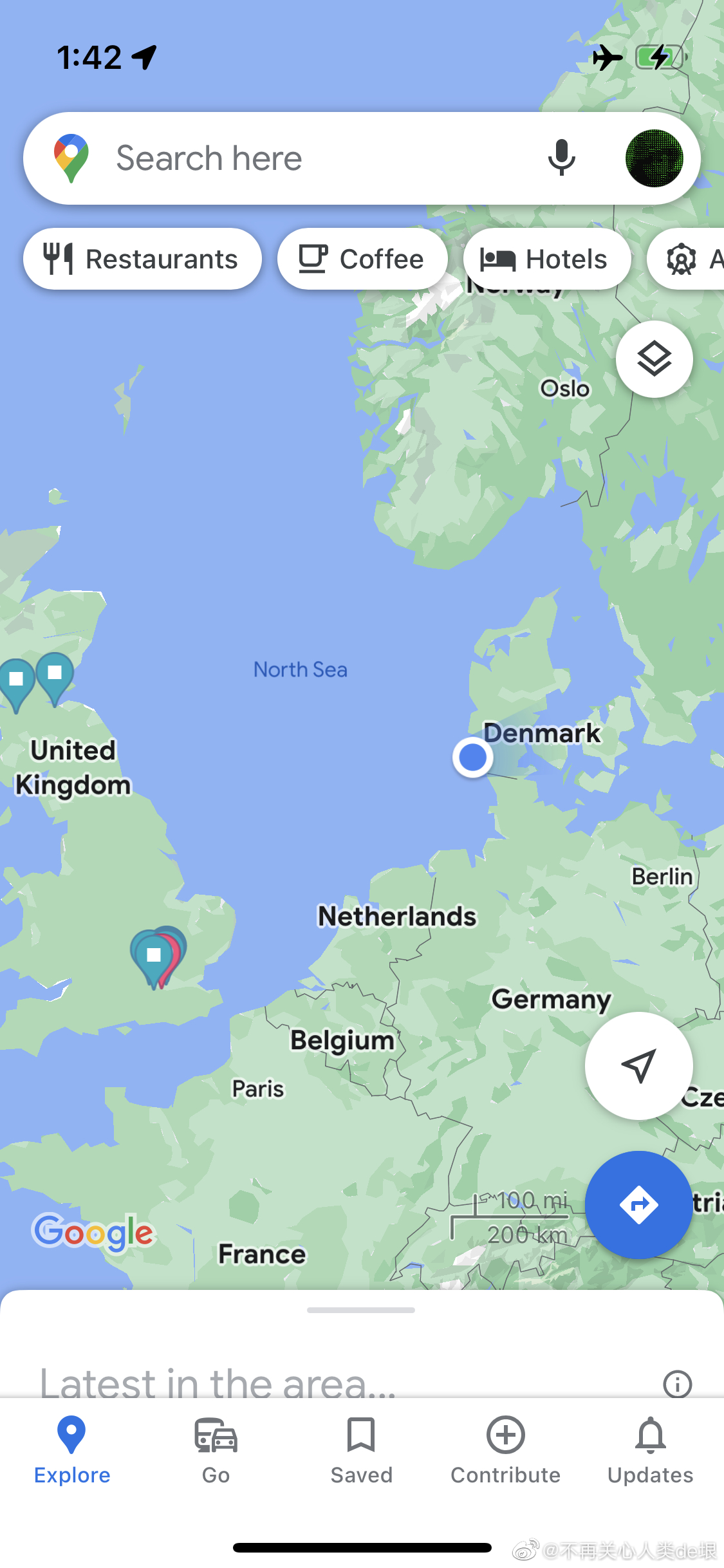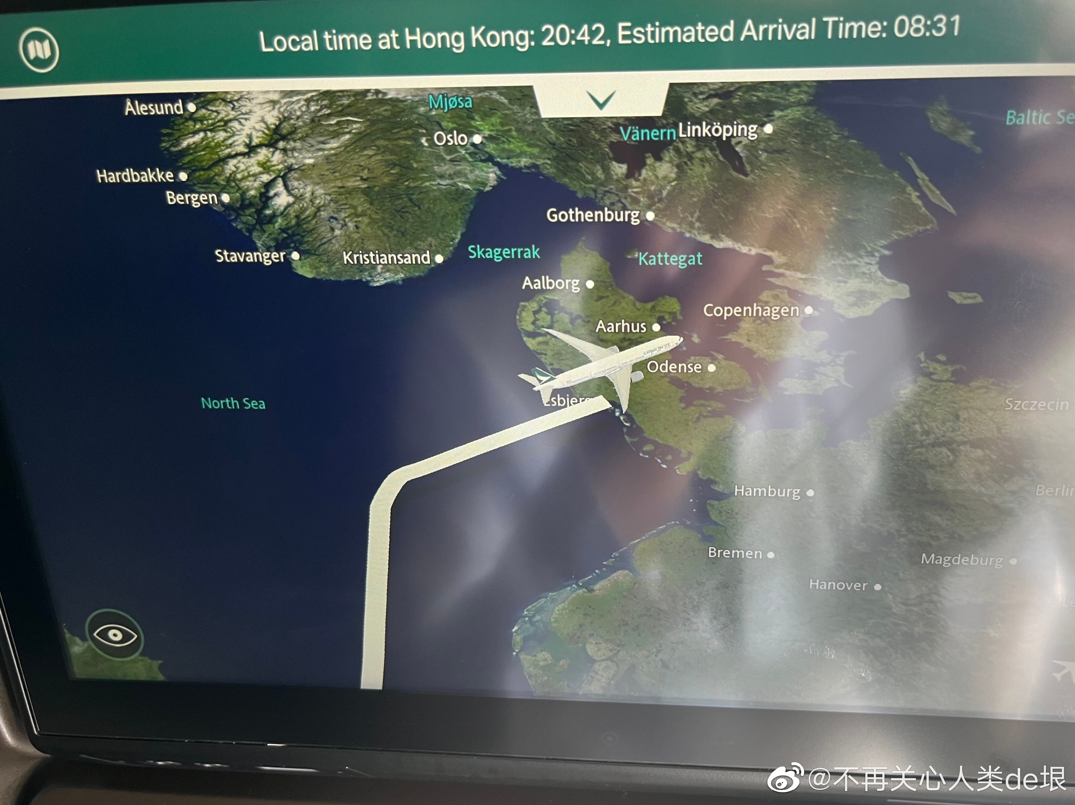 然而坐上飞机,到了丹麦上空的时候,我拿出手机(飞行模式),打开 Google 地图,居然发现它能定位,显示的位置跟飞机显示屏上的航线图显示的一样(图 1,2)。我没有使用机内的 wifi,这地图是 Google 地图之前缓存下来的,只有大框架,没有细节,但足够知道大概位置。后来我又试了几次,位置在持续更新,跟飞机的屏幕显示的位置一样,所以这应该不是我的错觉(图 3)。