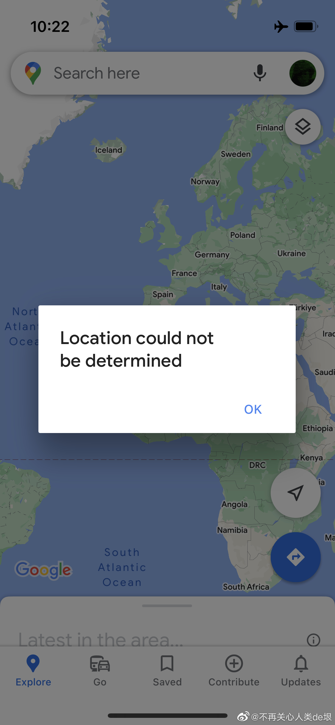 等飞机到了亚洲上空的时候,我再拿出手机,一样的打开 Google 地图,又不能定位了(图 4)。最开头它显示了一个点在非洲上空的赤道上,但那显然是错的,是一个软件设置的“缺省位置”。接着就显示“无法定位”的错误信息。先后试了几次都是一样,完全没法定位。