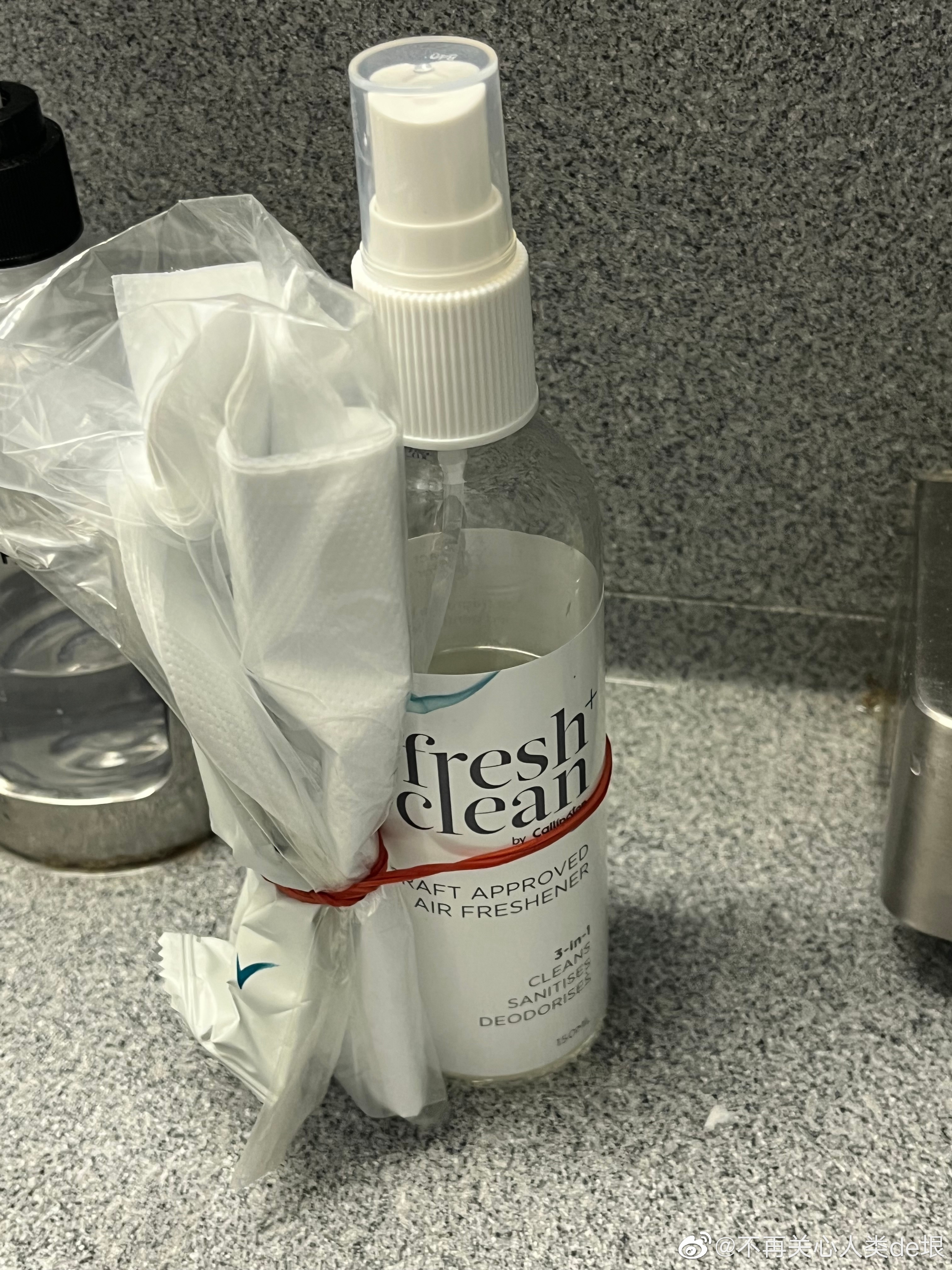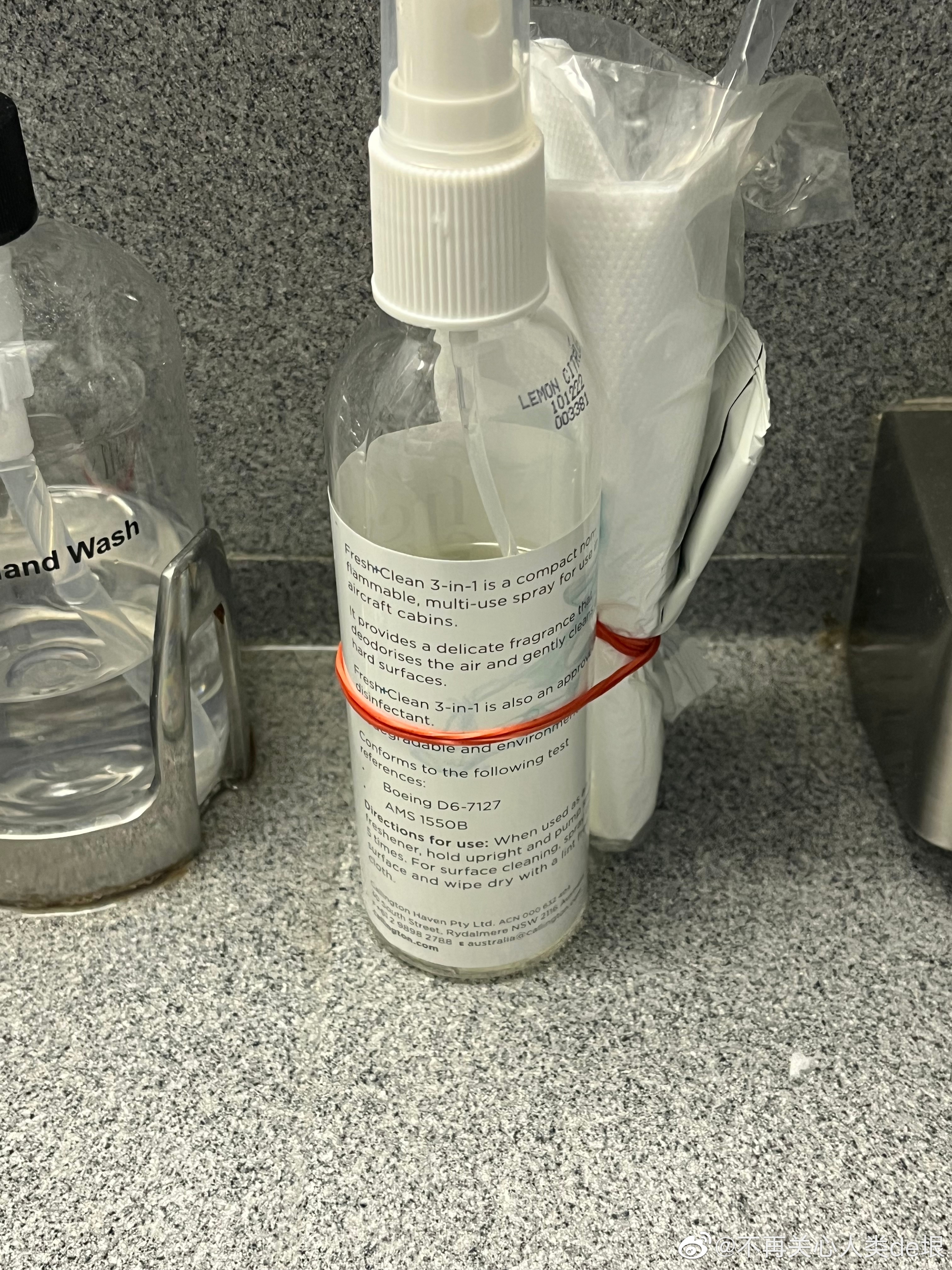根据在爱丁堡 Airbnb 的经验,我知道这个空气清新剂的来源大概就在附近。我到处找,发现下面有一个放“女士卫生废物”的橱柜。拉开橱柜门,发现里面有个喷雾瓶,外面缠着一些东西(图 1)。我把它拿出来,发现外面缠着的似乎是一些一次性手套,瓶子上写着「Fresh Clean」Aircraft Approved Air Refrenshener(飞行器许可使用的空气清新剂)。制造商是 Callington Haven Pty Ltd,一个澳大利亚公司。(图2,3)