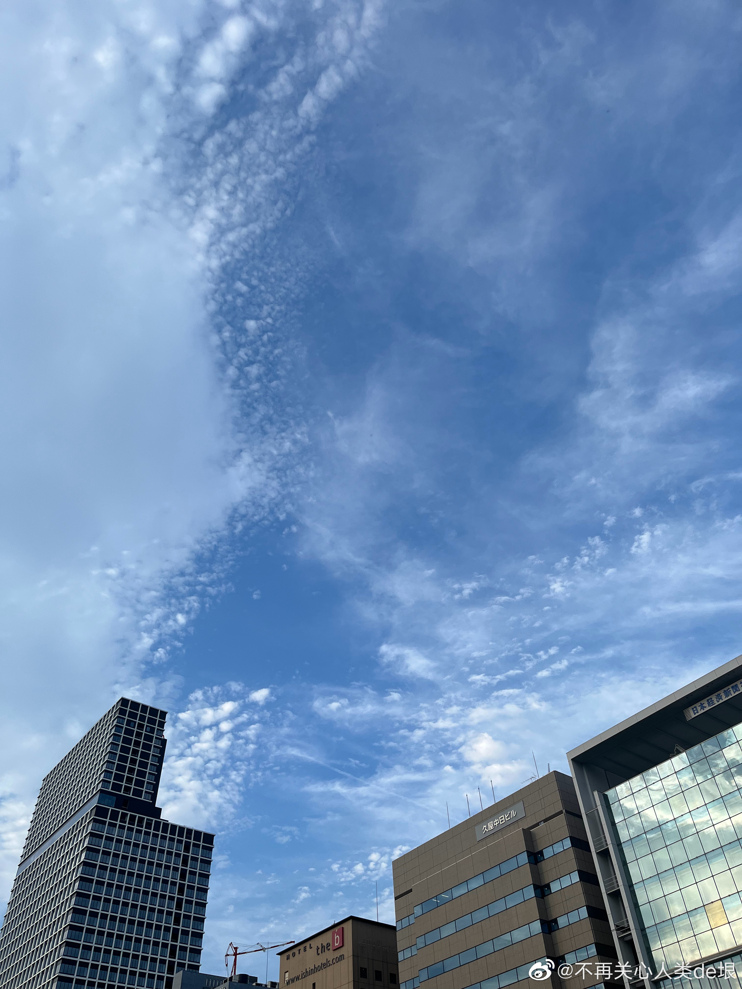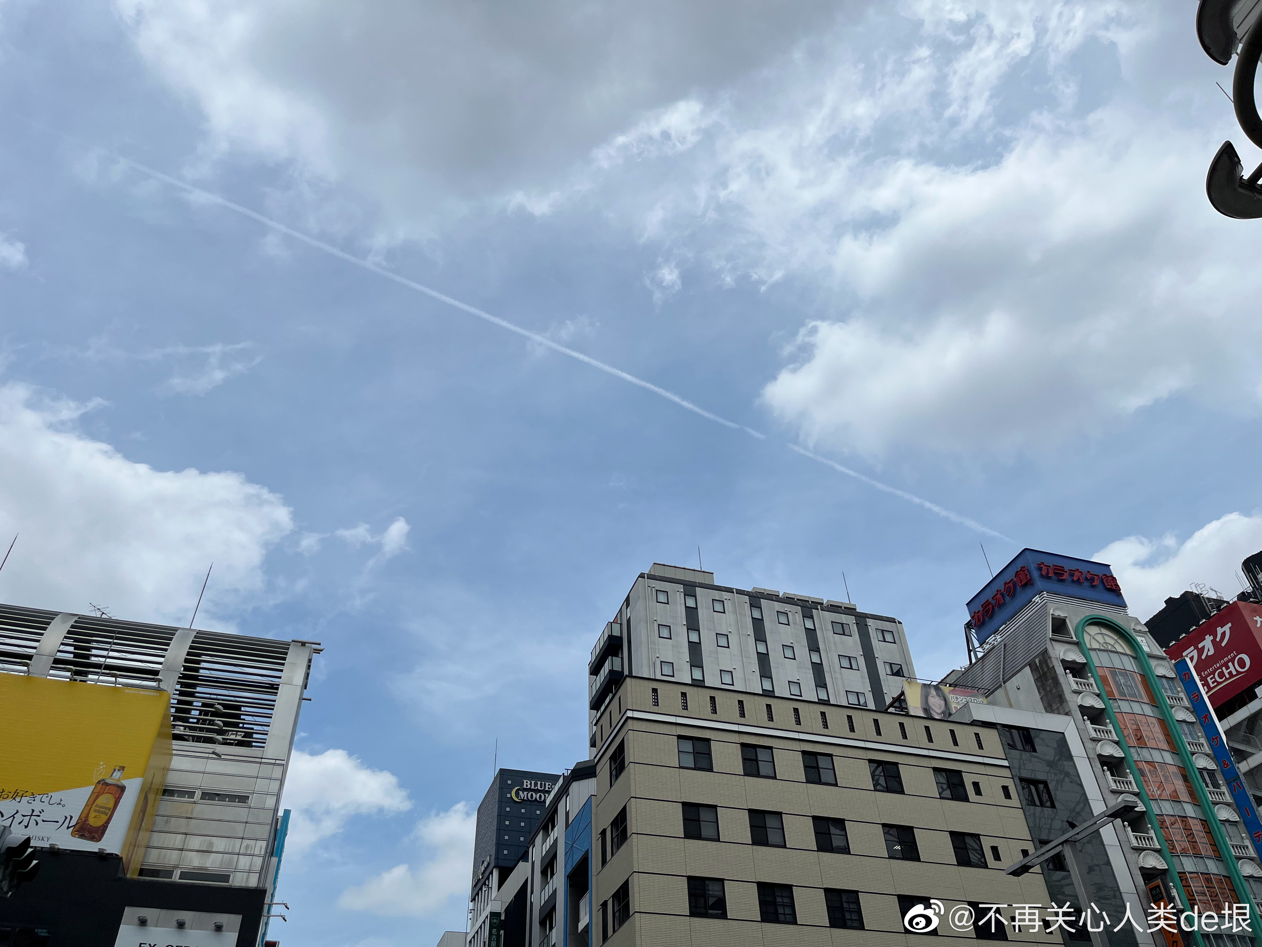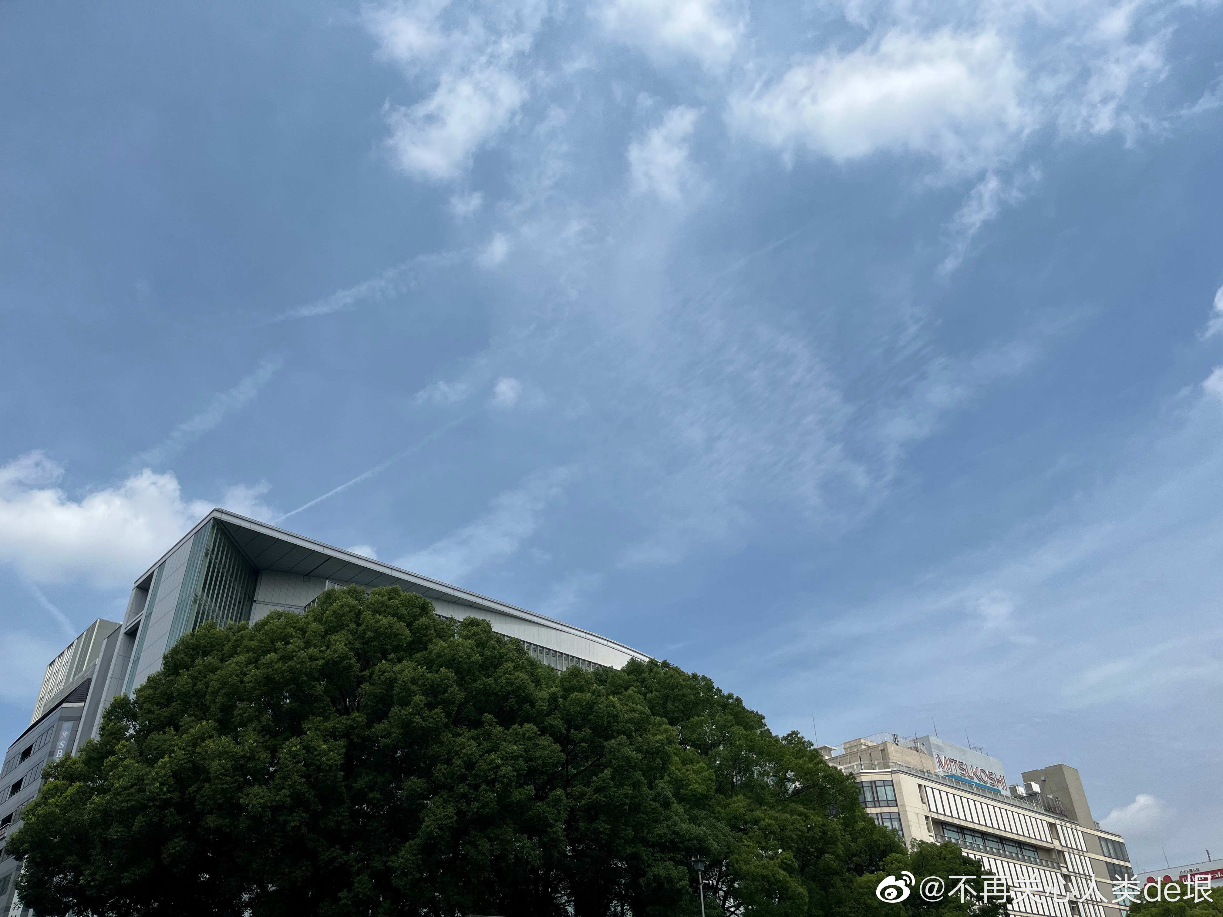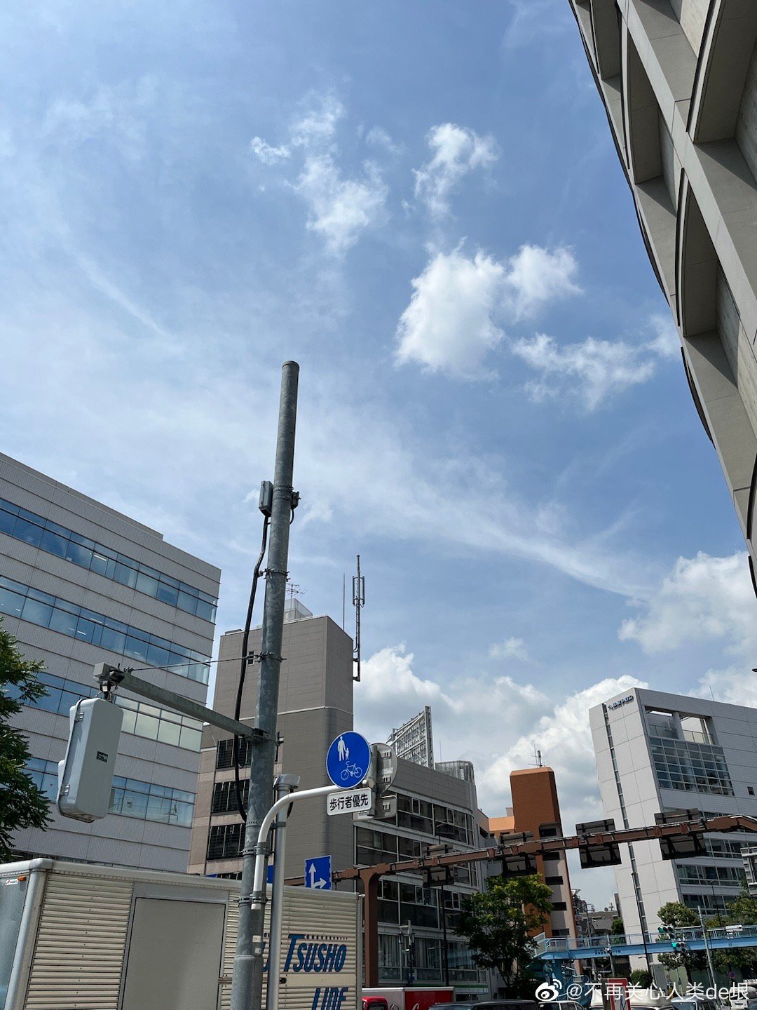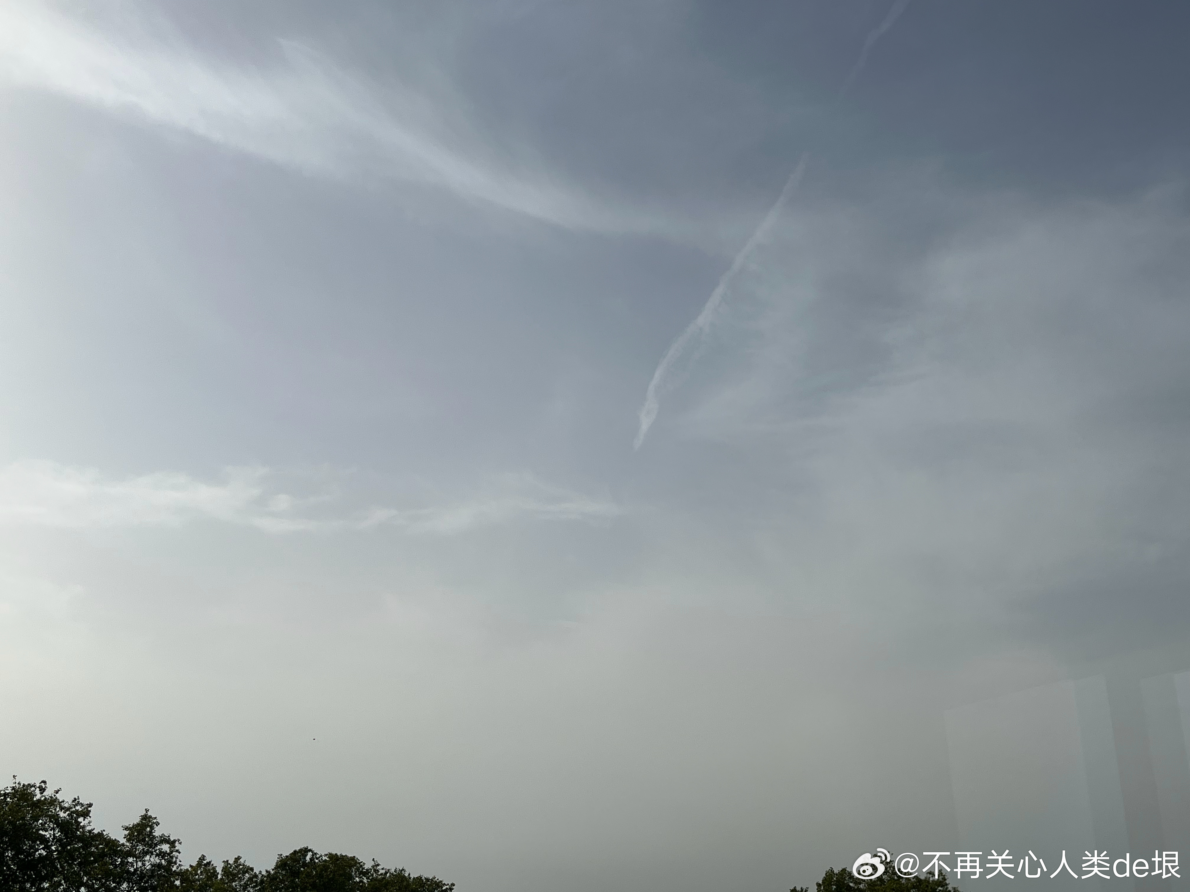 傍晚拍到一张更明显的,看那条很长的白线。那只可能是飞机弄出来的。 可能本来是在云上面喷洒,以为人看不见。哪知道被风一吹,整体飘出来,就暴露了。 日本·东京