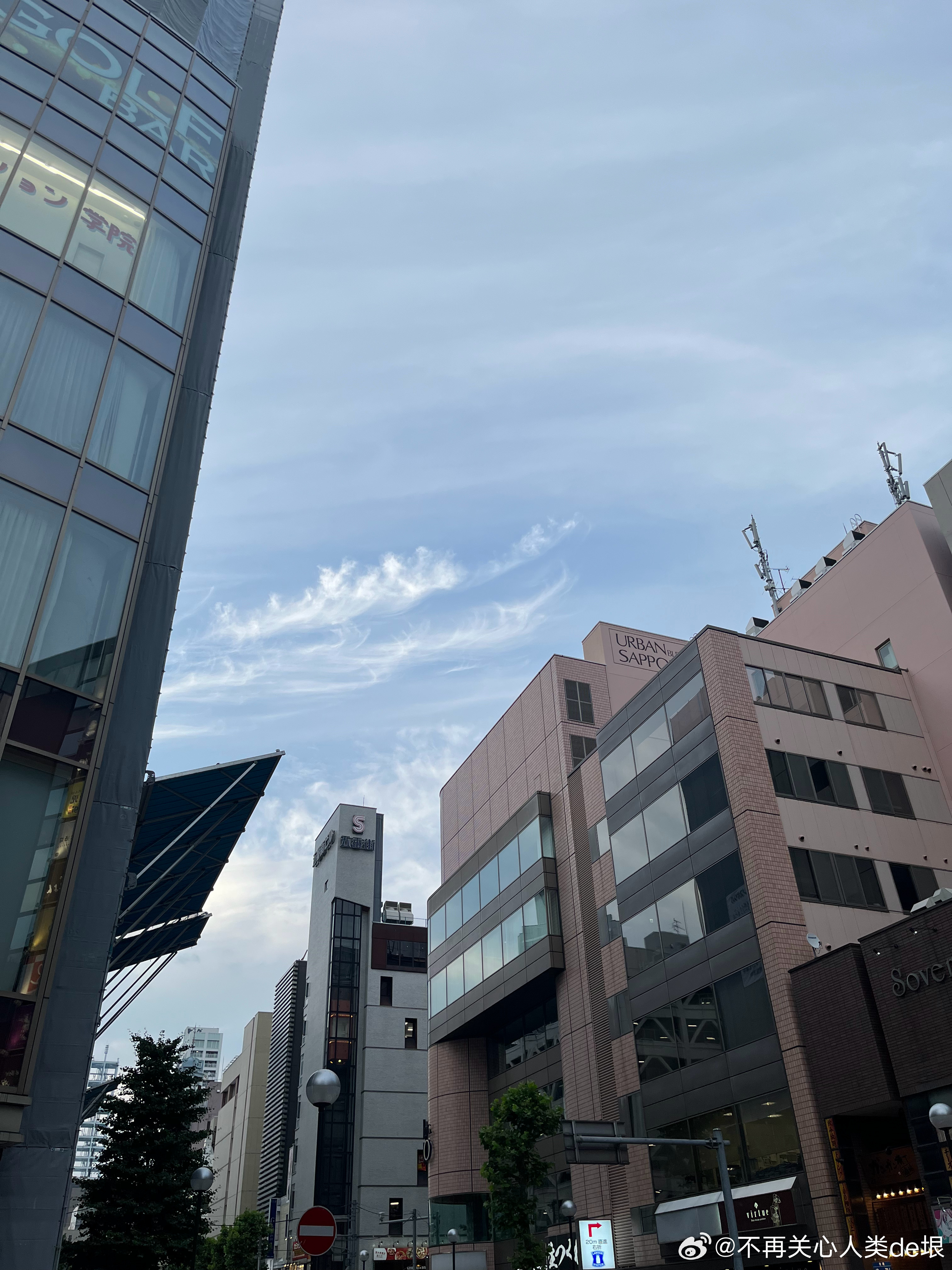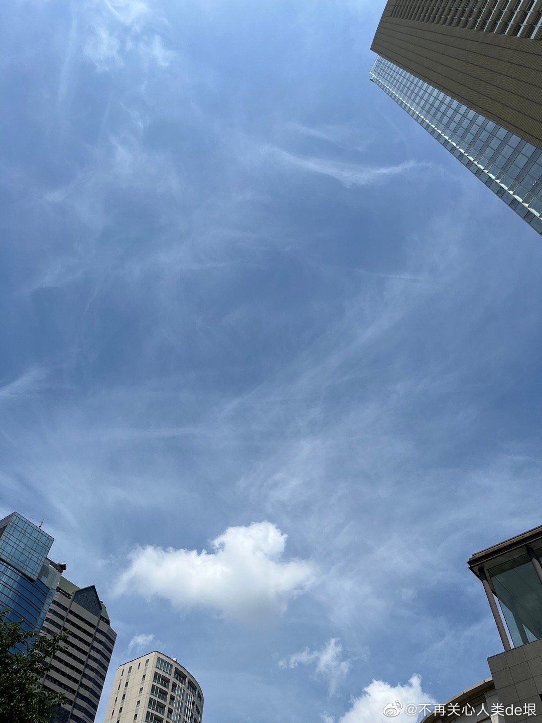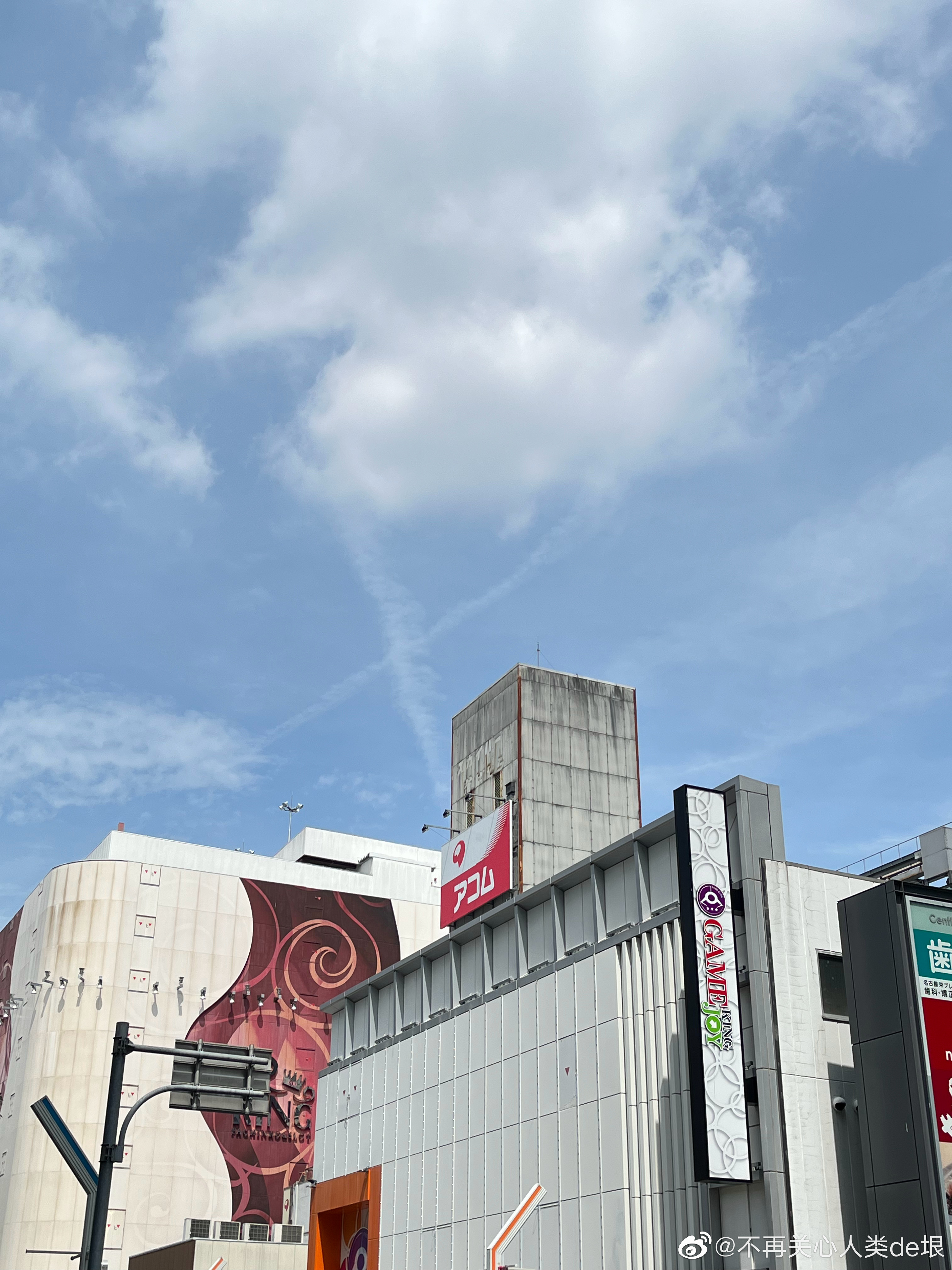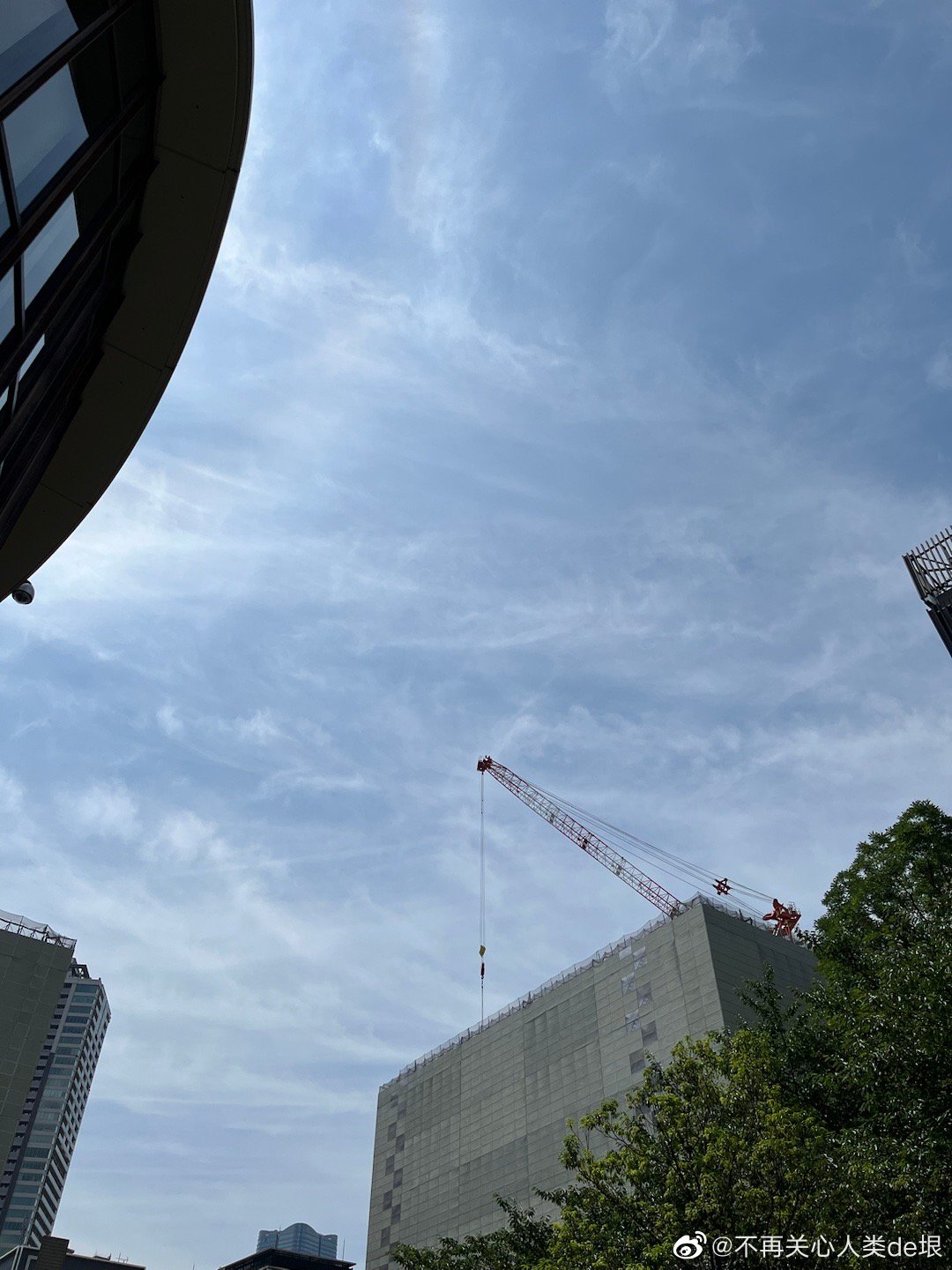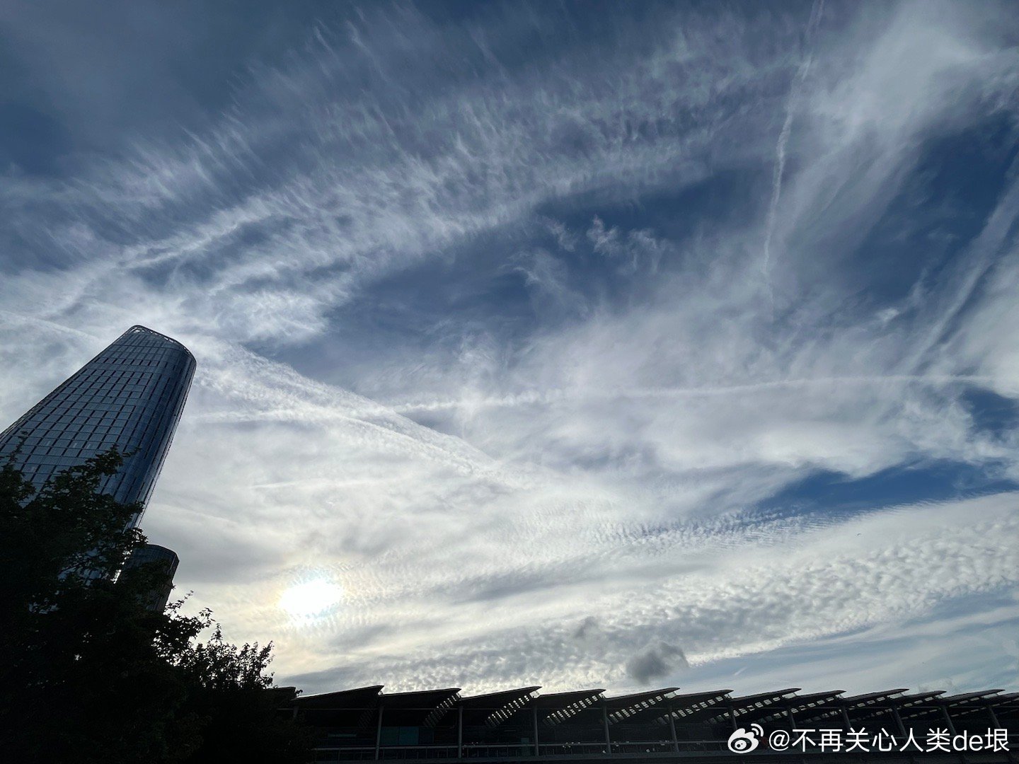 傍晚拍到一张更明显的,看那条很长的白线。那只可能是飞机弄出来的。 可能本来是在云上面喷洒,以为人看不见。哪知道被风一吹,整体飘出来,就暴露了。 日本·东京