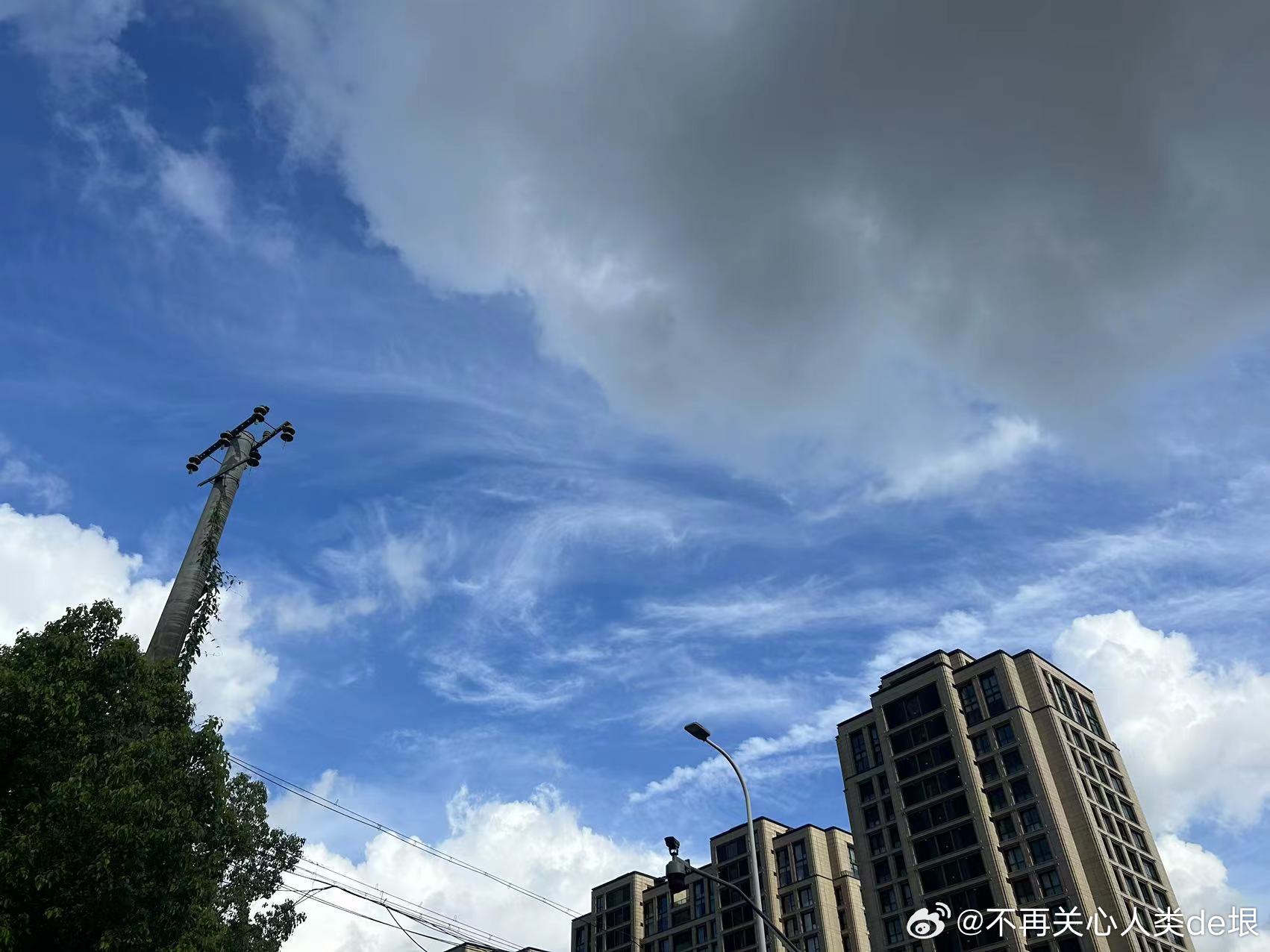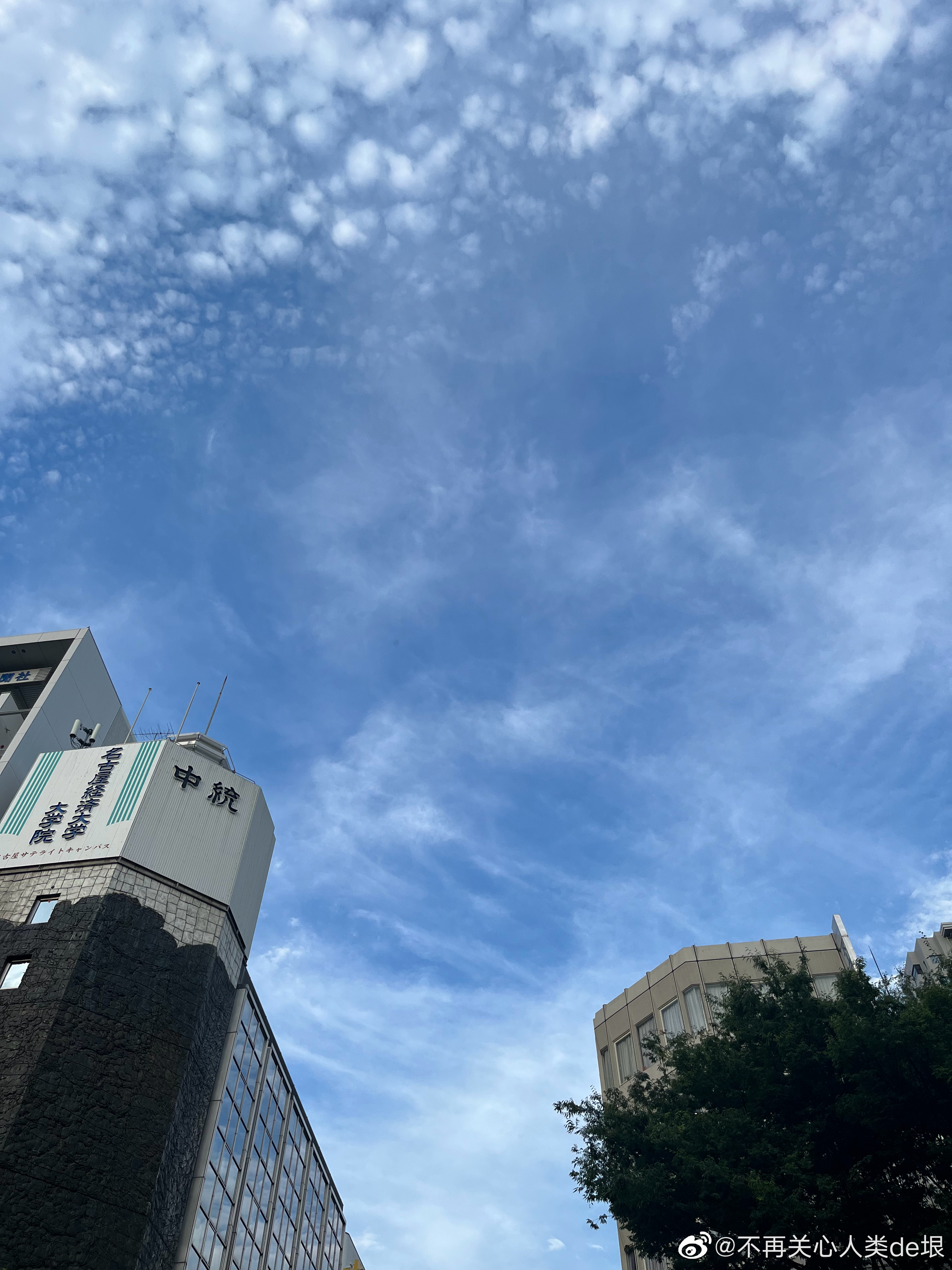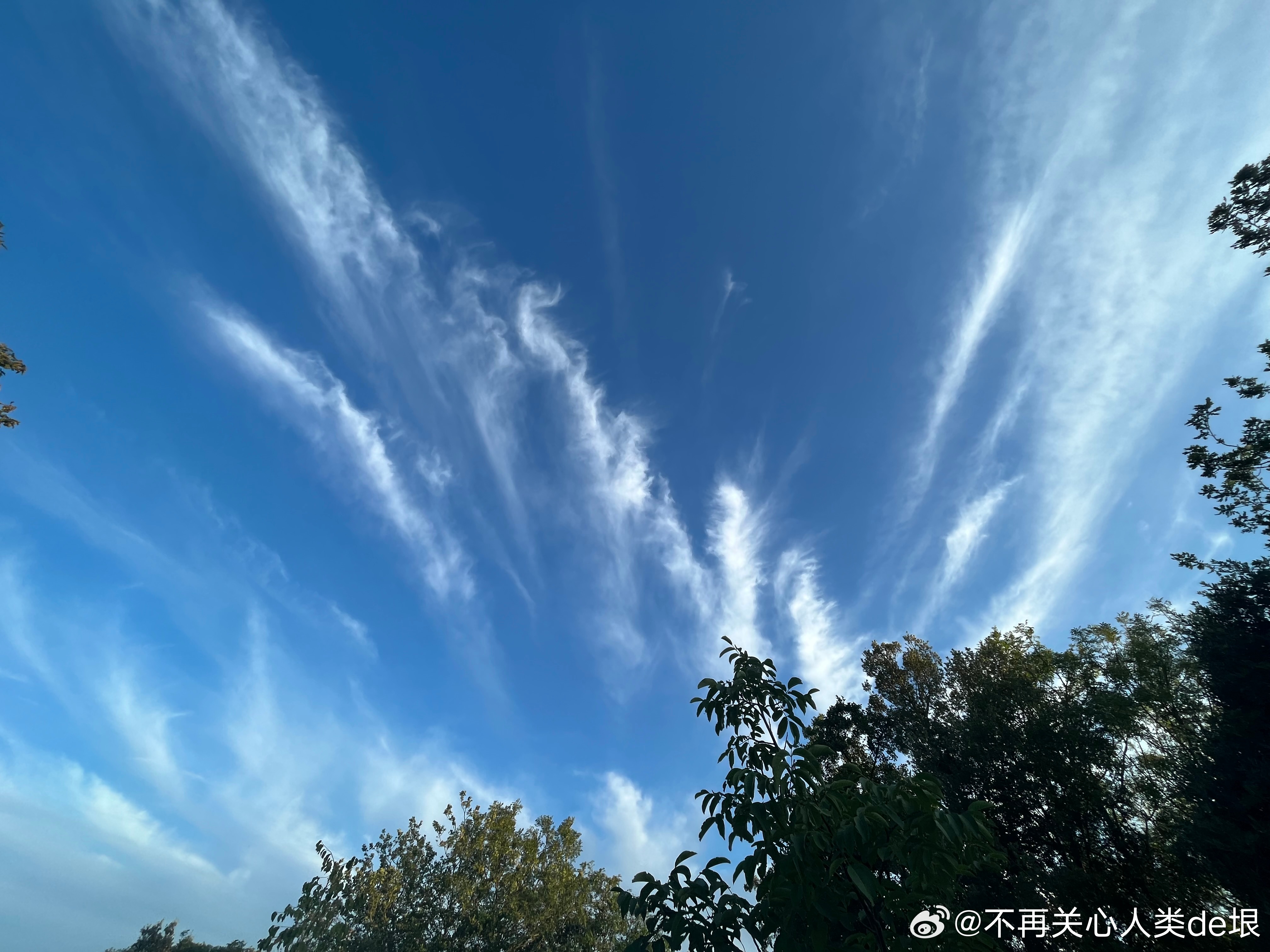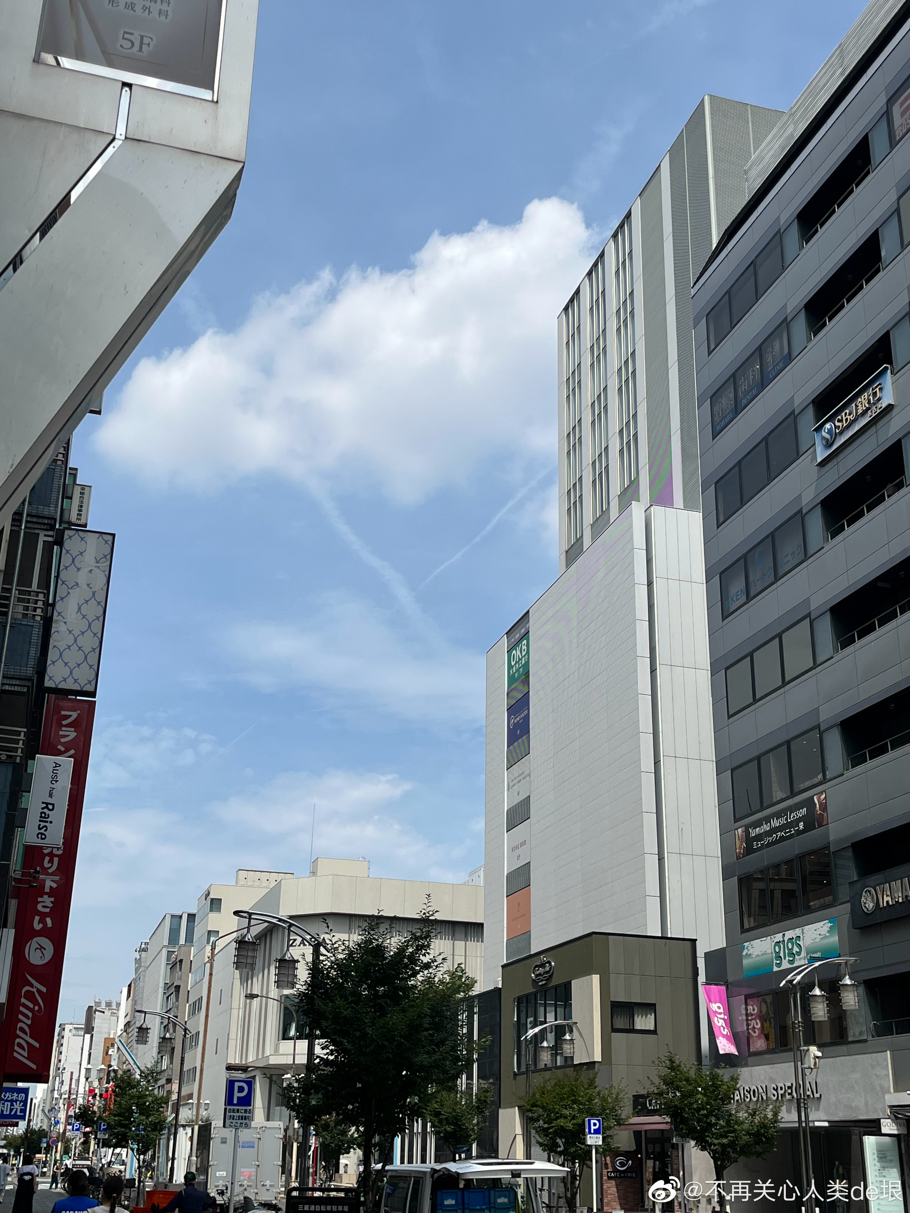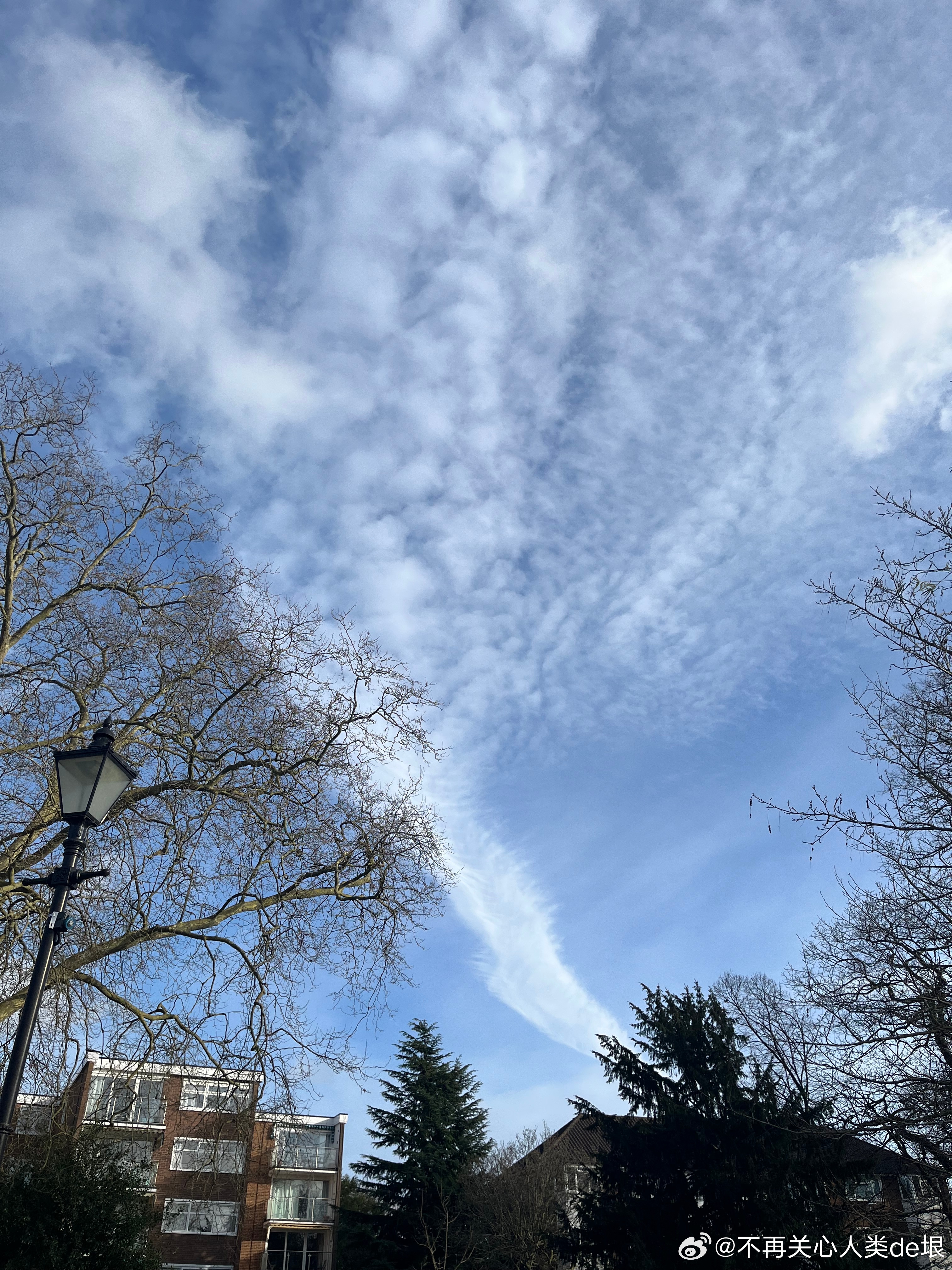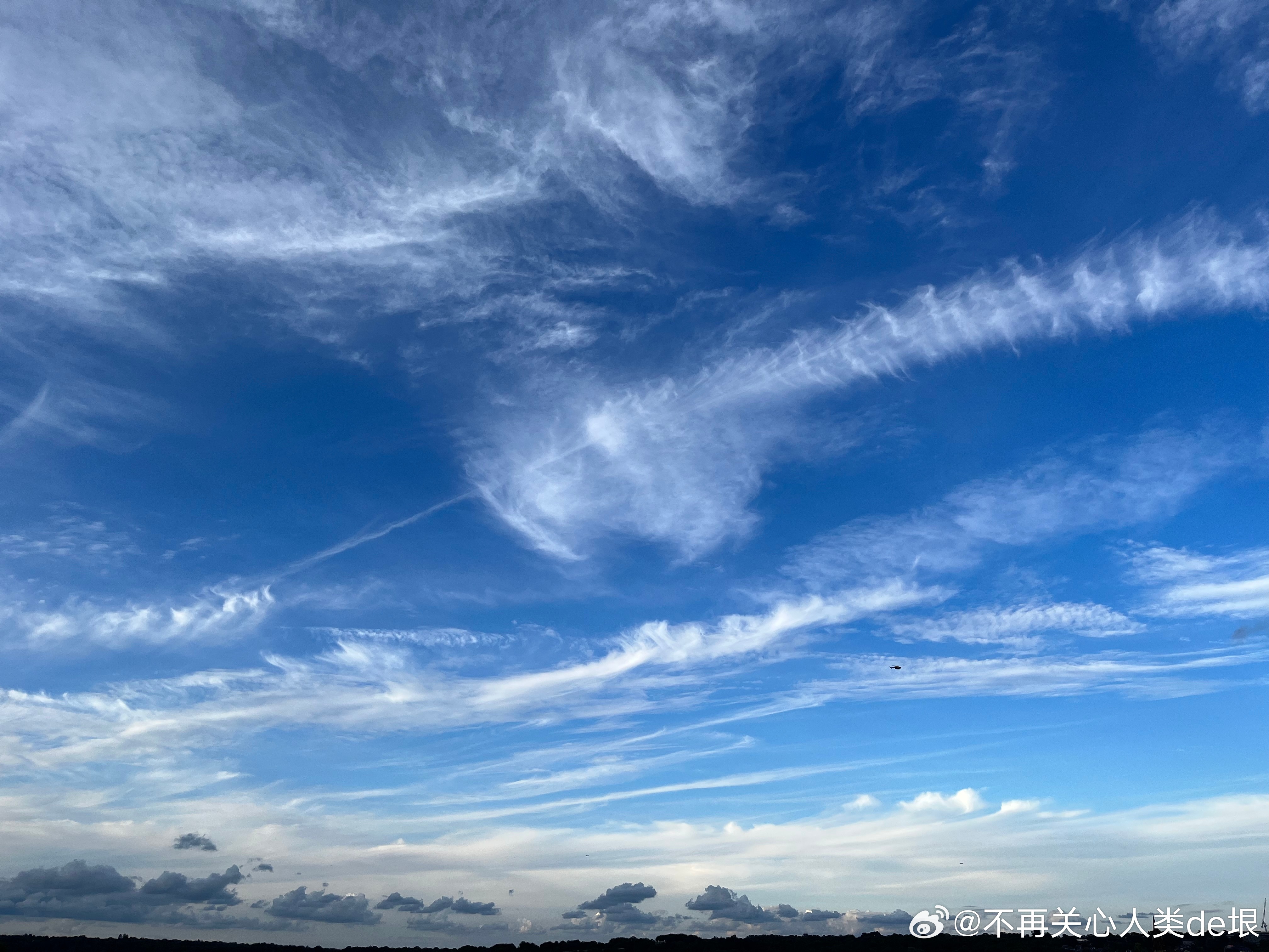 傍晚拍到一张更明显的,看那条很长的白线。那只可能是飞机弄出来的。 可能本来是在云上面喷洒,以为人看不见。哪知道被风一吹,整体飘出来,就暴露了。 日本·东京