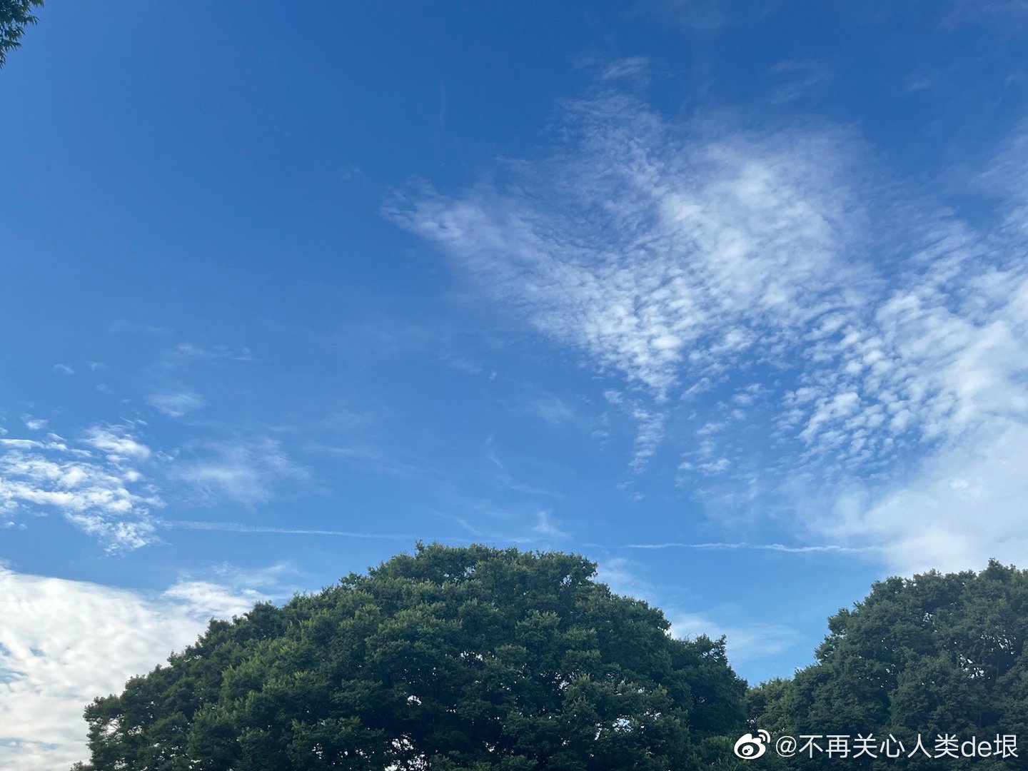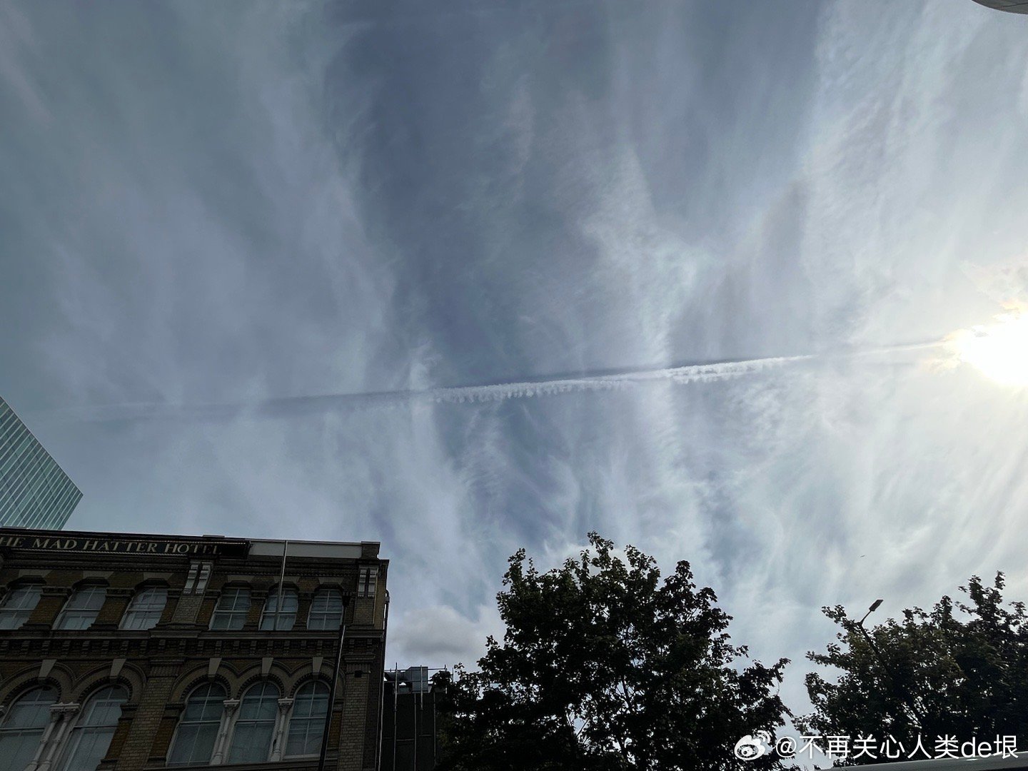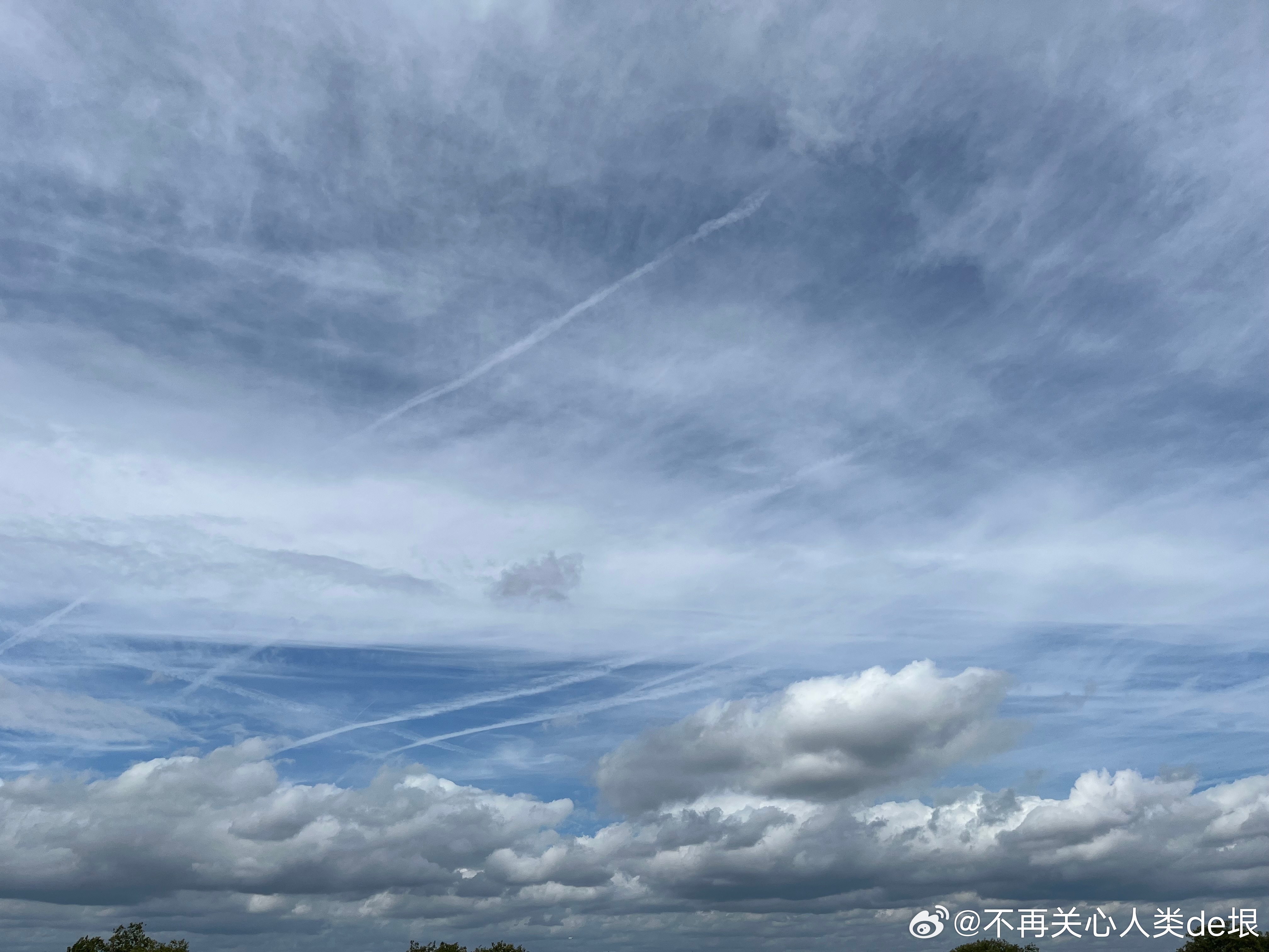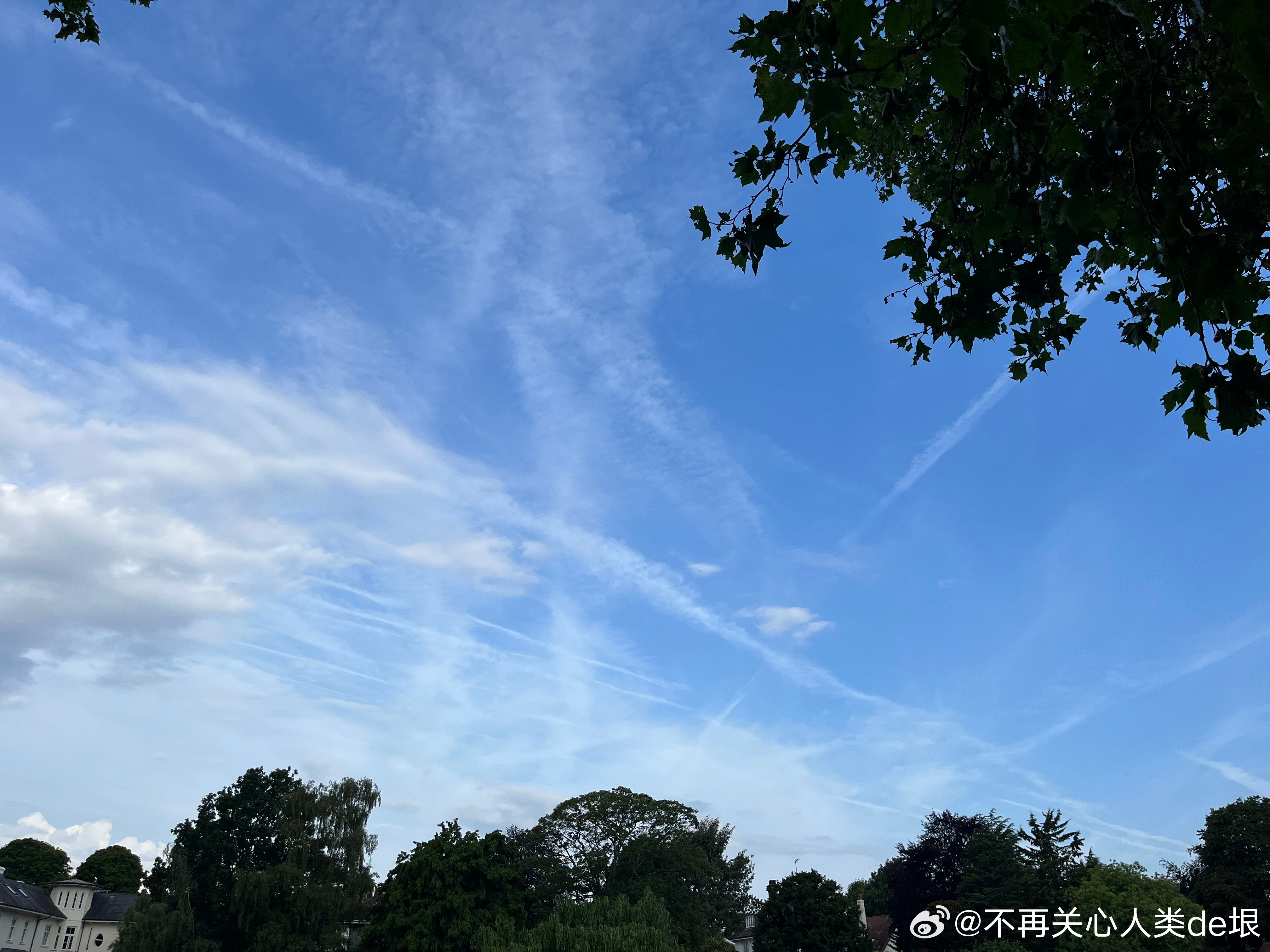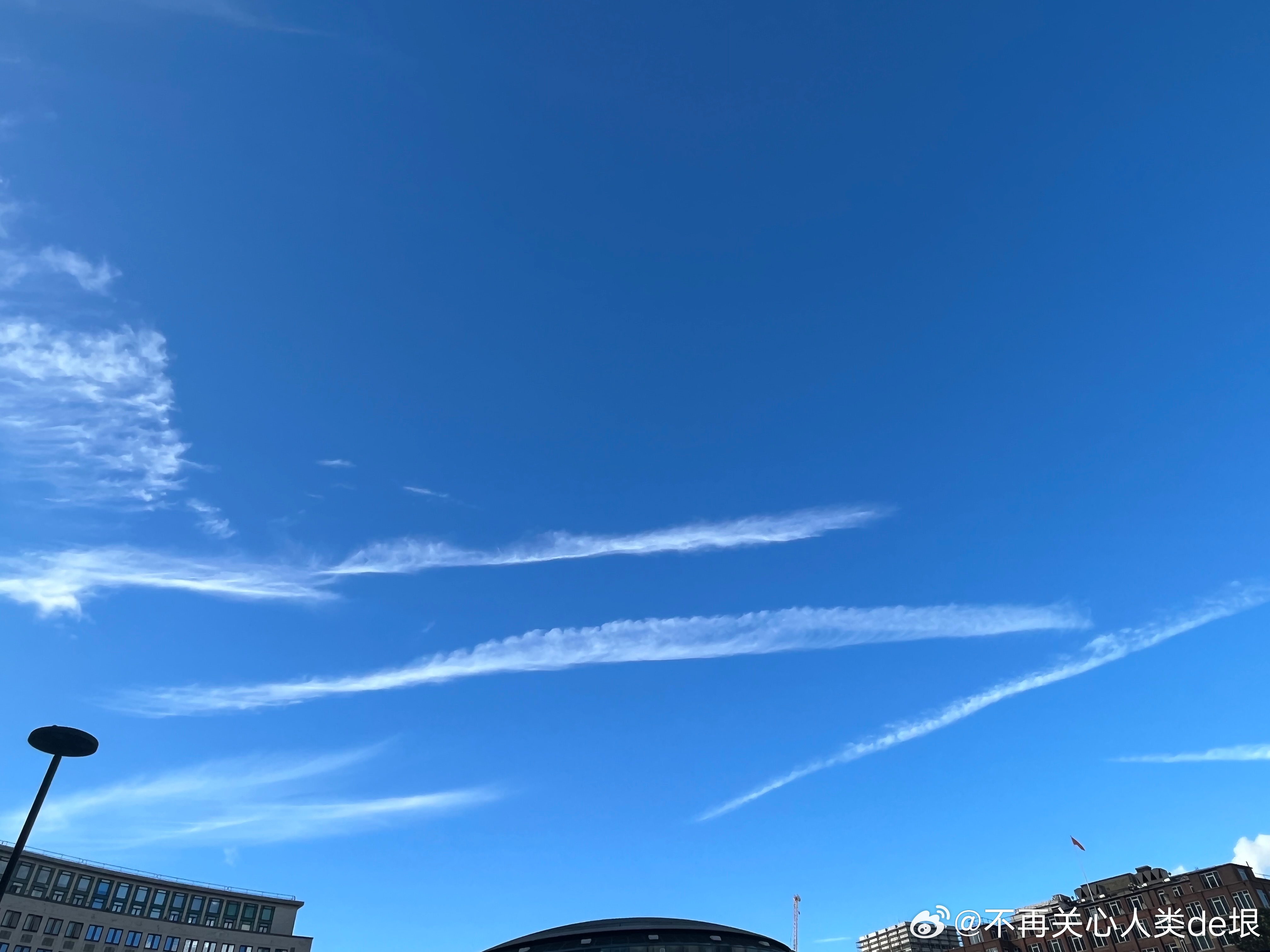东京的早晨,只看见扩散的尾迹,没看见飞机。技术很巧妙 幸好我已经接受了伦敦的“尾迹图像识别训练”,不然不容易看出这些并不是真正的云。看来全世界都一样,没有一个国家可以例外。