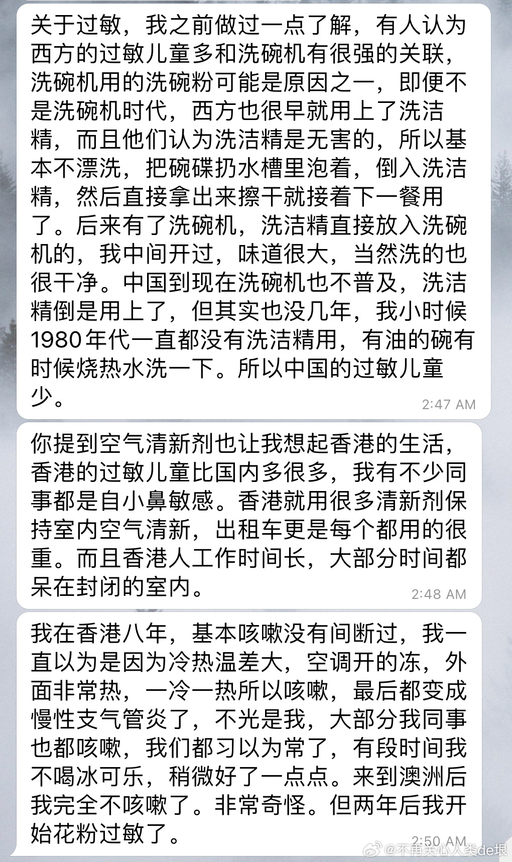 有人跟我说,我遇到的那些“空气清新剂”的气味,可能是故意释放的有毒物质。因为主要成分(有毒物质)有异味,没人会喜欢,所以加入了大量的“香料”来掩盖它。我之前也觉得应该就是这样的。这就是为什么所有这些“空气清新剂”都是差不多的气味,人会直觉地知道它有毒。
