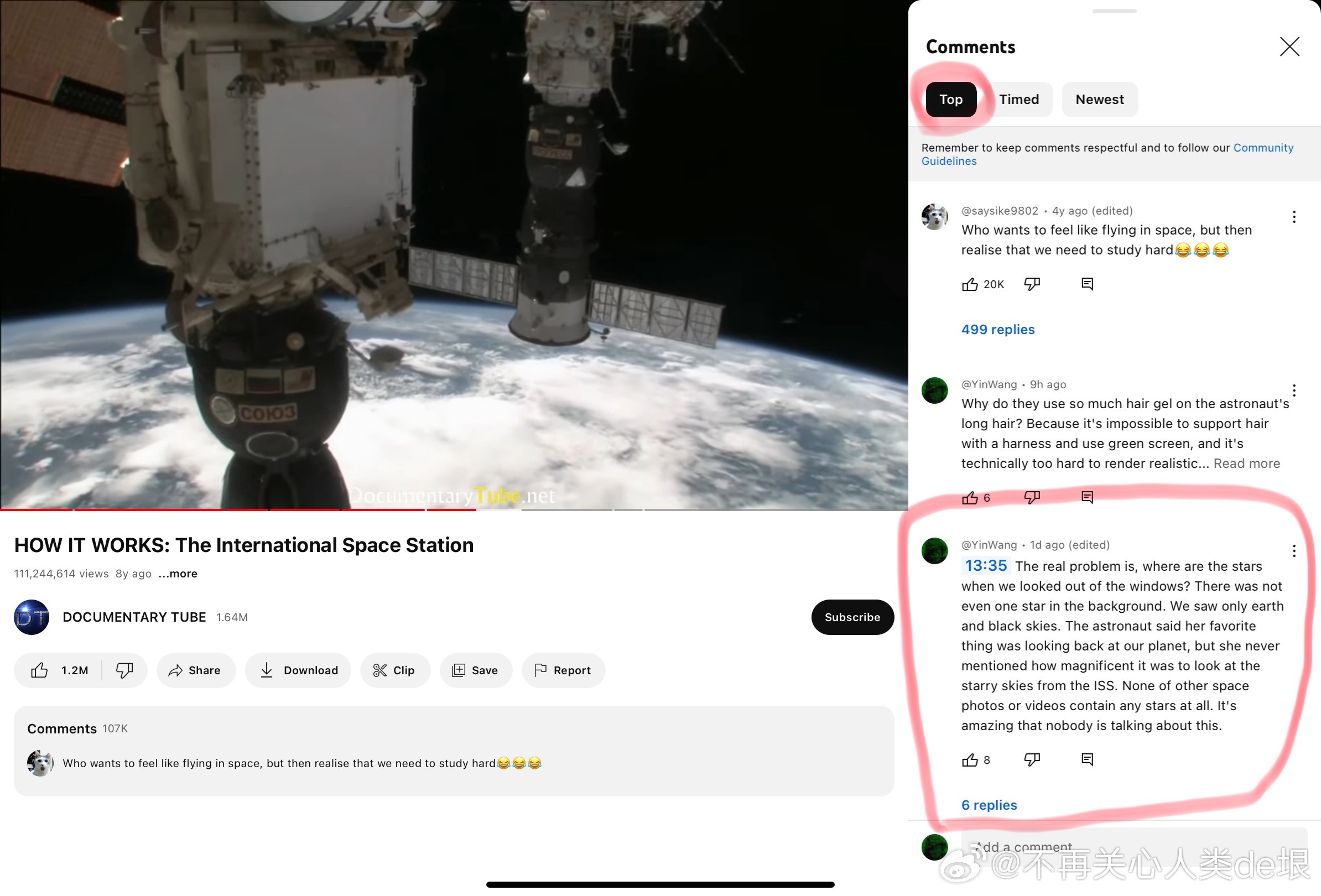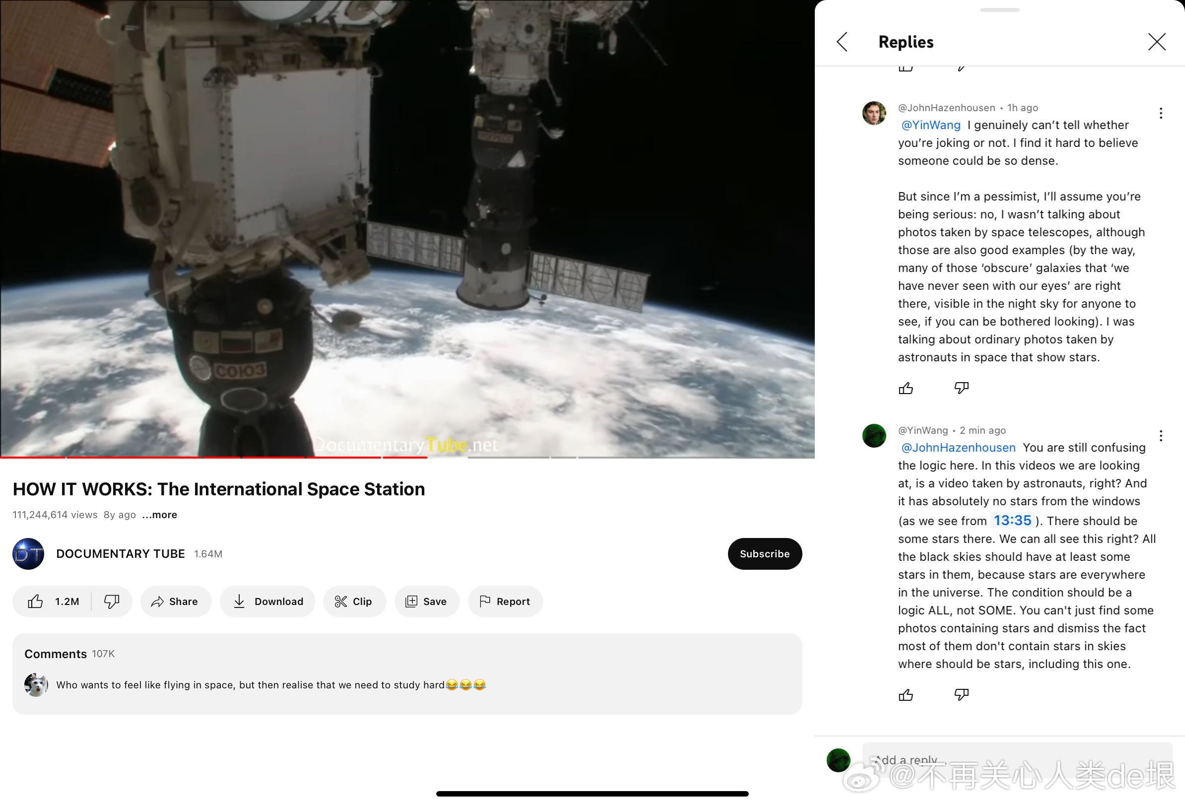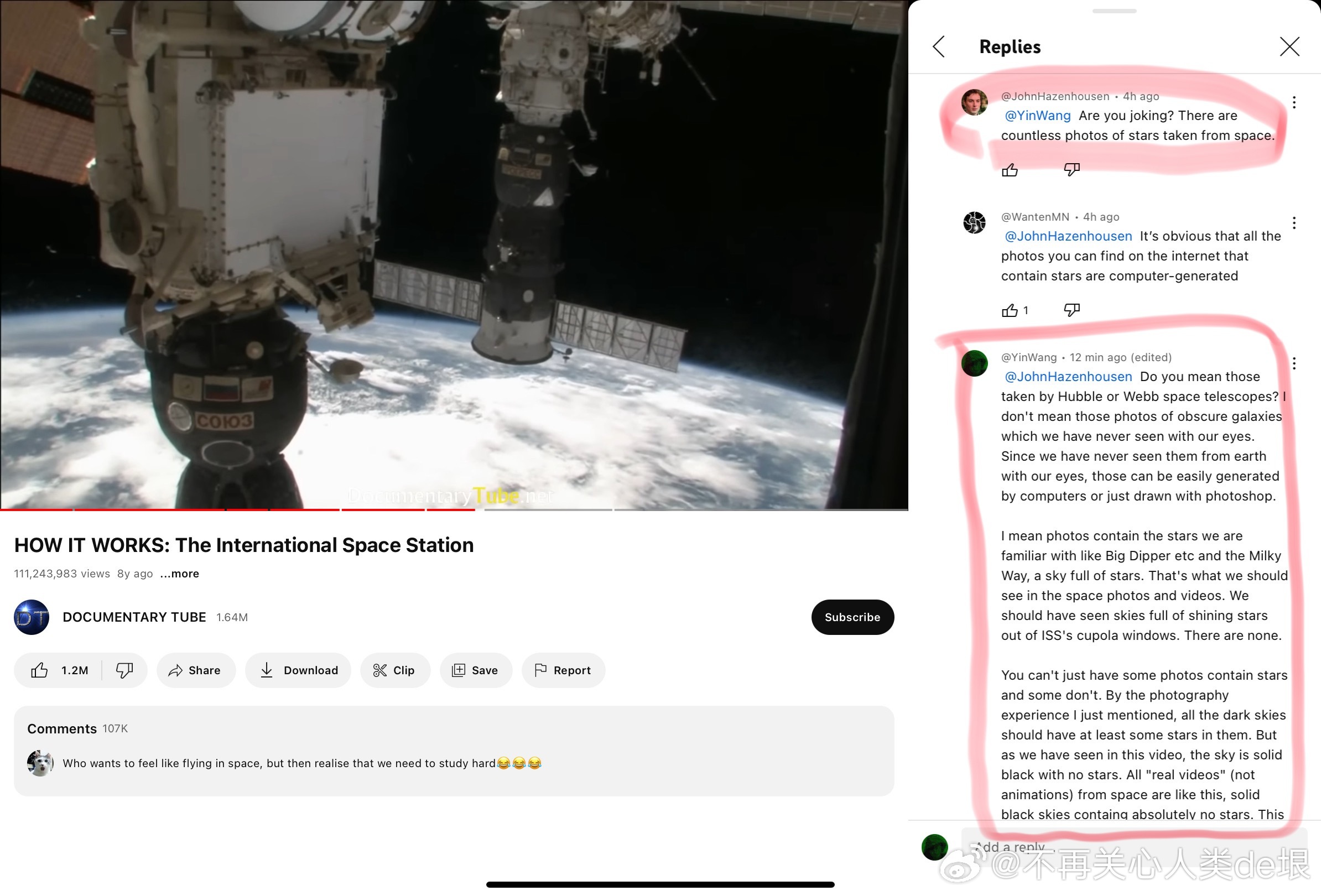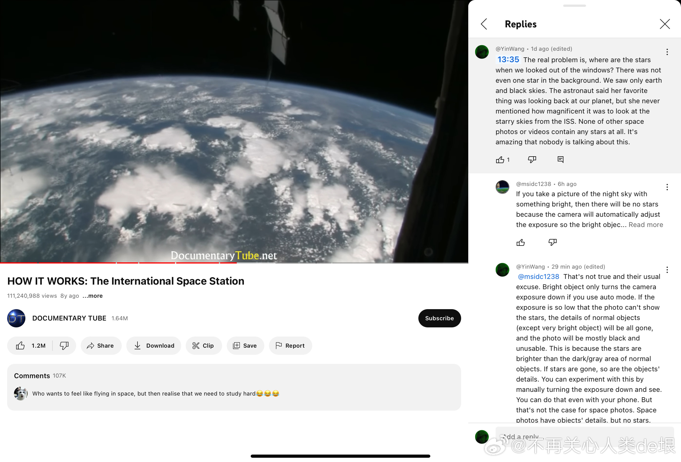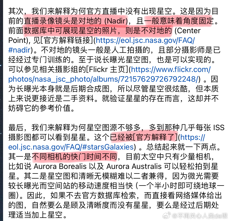 有人跟我说,空间站还是真的吧,国际空间站天天都在直播。其实我之前已经指出过,这些所谓的“国际空间站直播”都是假的,完全看不到星空。之前有大概两个 YouTube 频道,号称是“ISS 直播”,但却不是 NASA 官方频道。