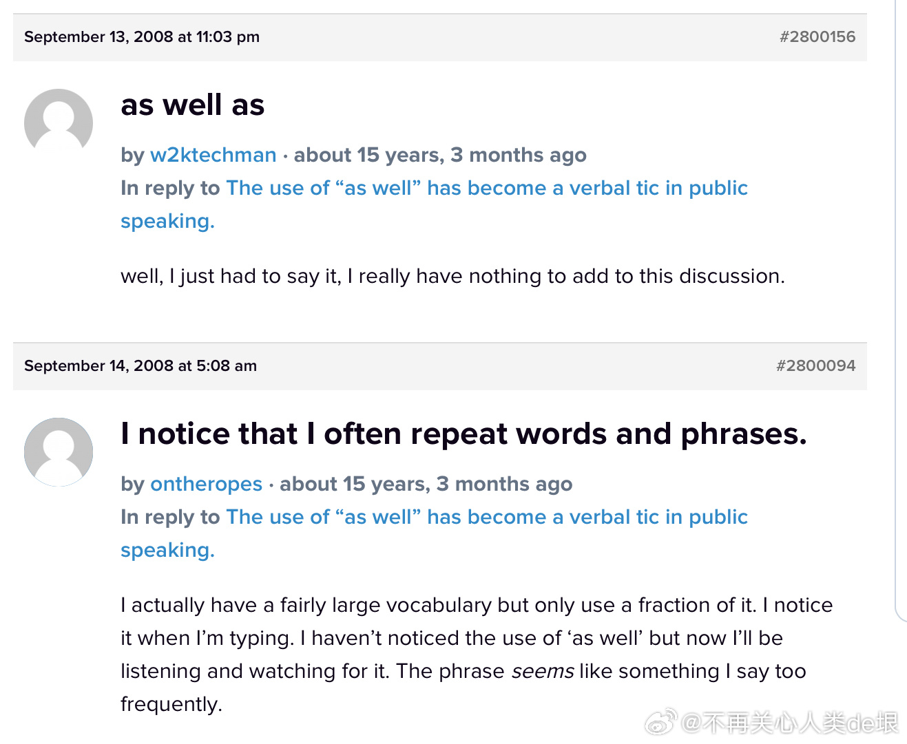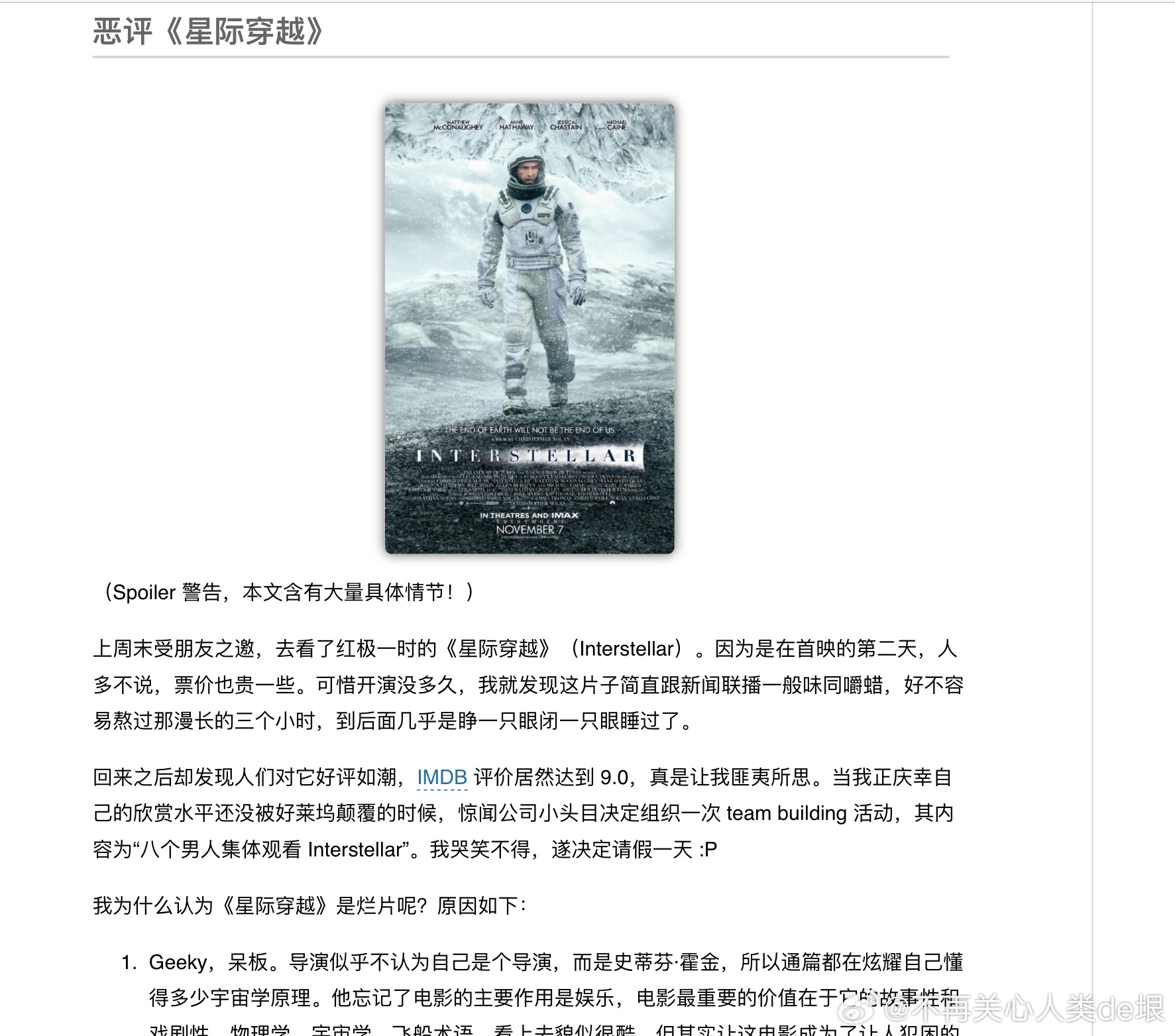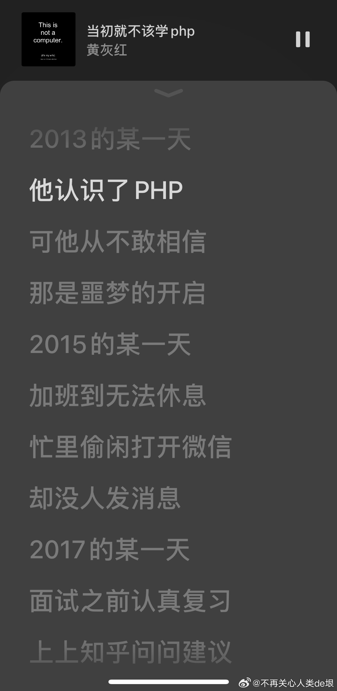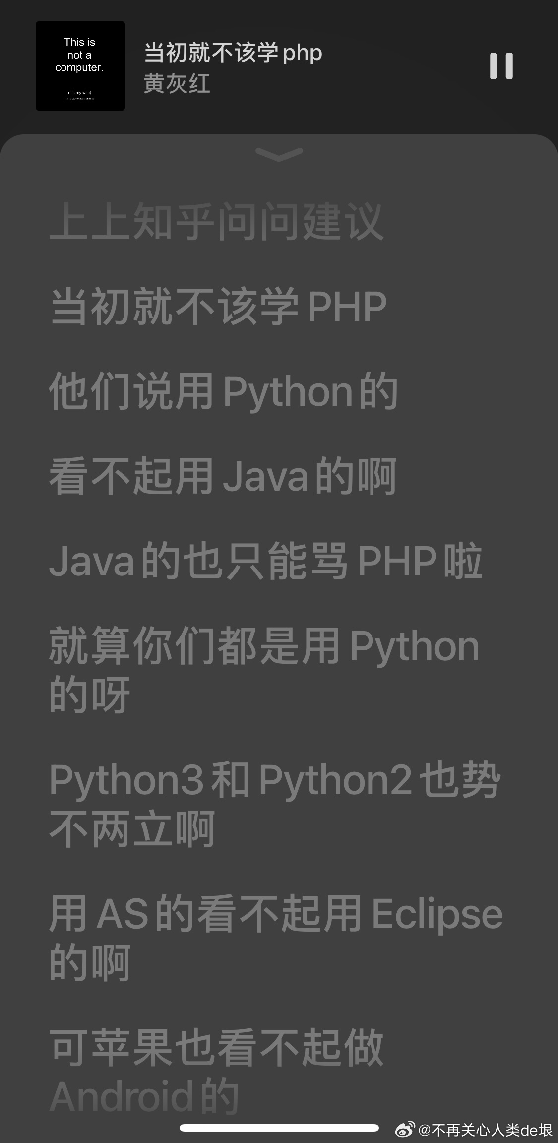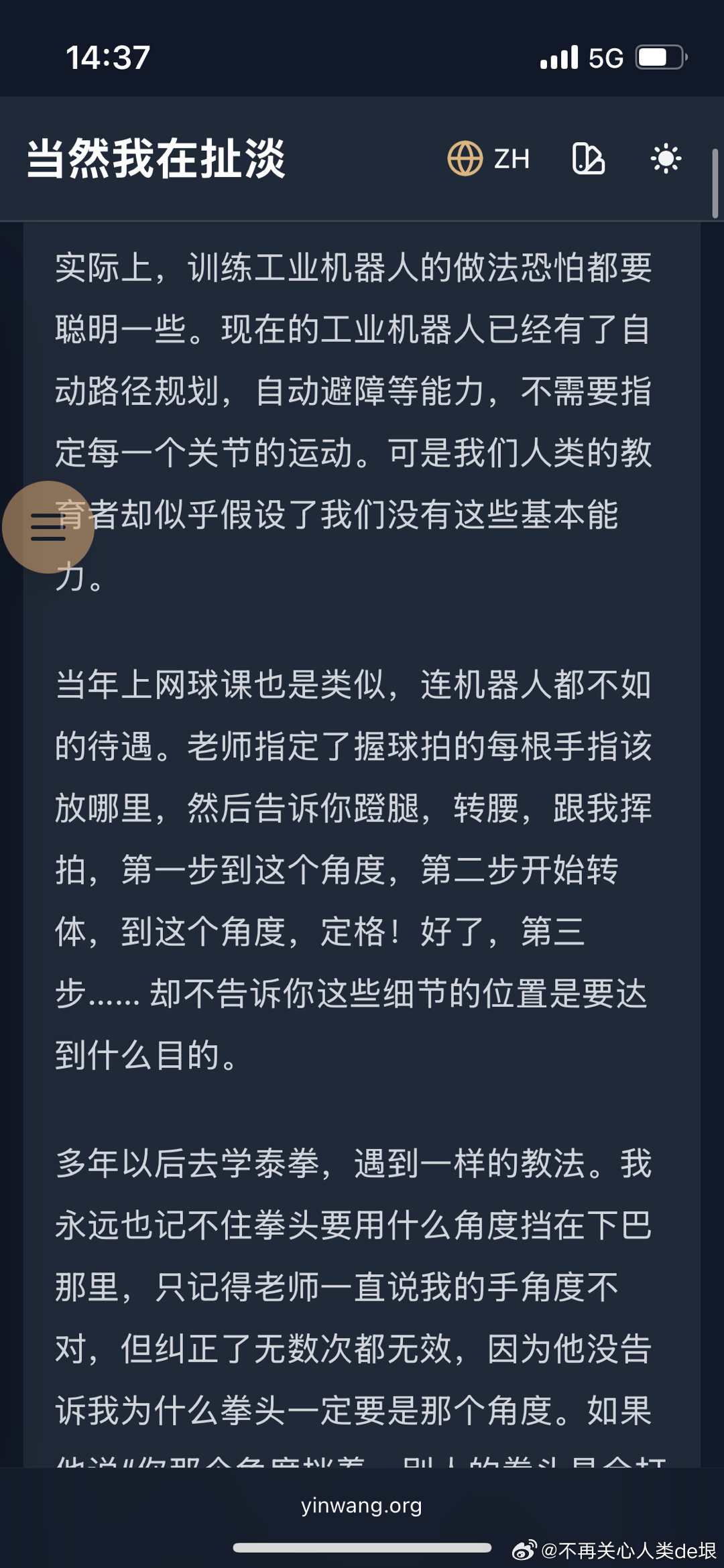有人可能会好奇,为什么隔了20多年,我这么确定当时的网球技术是在两周之内练成的,也许我花了更长时间呢?很简单。因为我对于一件事情的耐心,通常只有不到两周(甚至只有一周)的时间。如果练习了两周网球还不能上场打球实战,按照我的性格,我是不大可能继续下去的。不过很可惜,我当时只打了一个月,就不再打网球。 不再关心人类de垠的微博视频