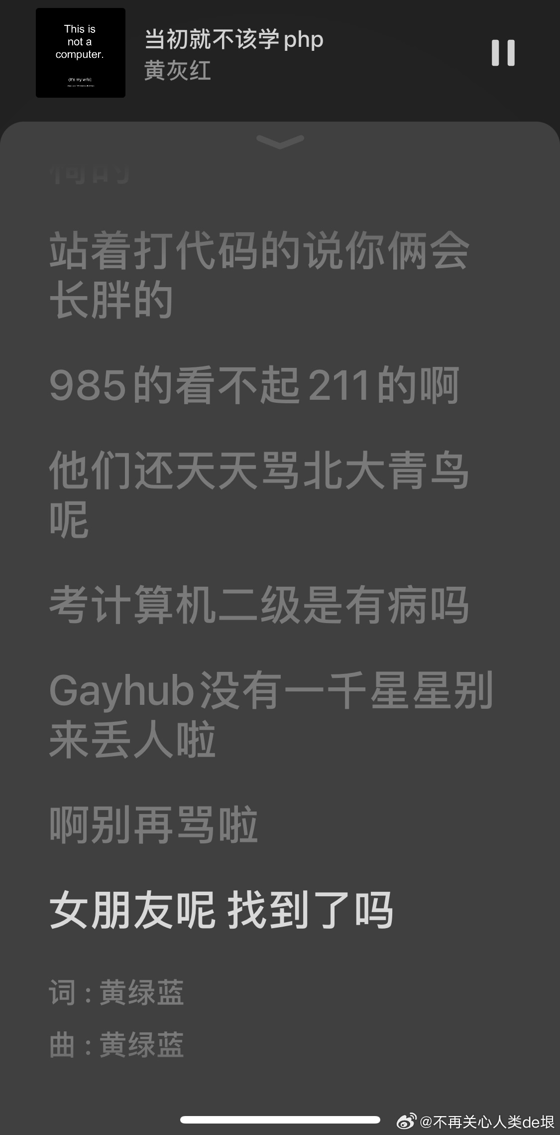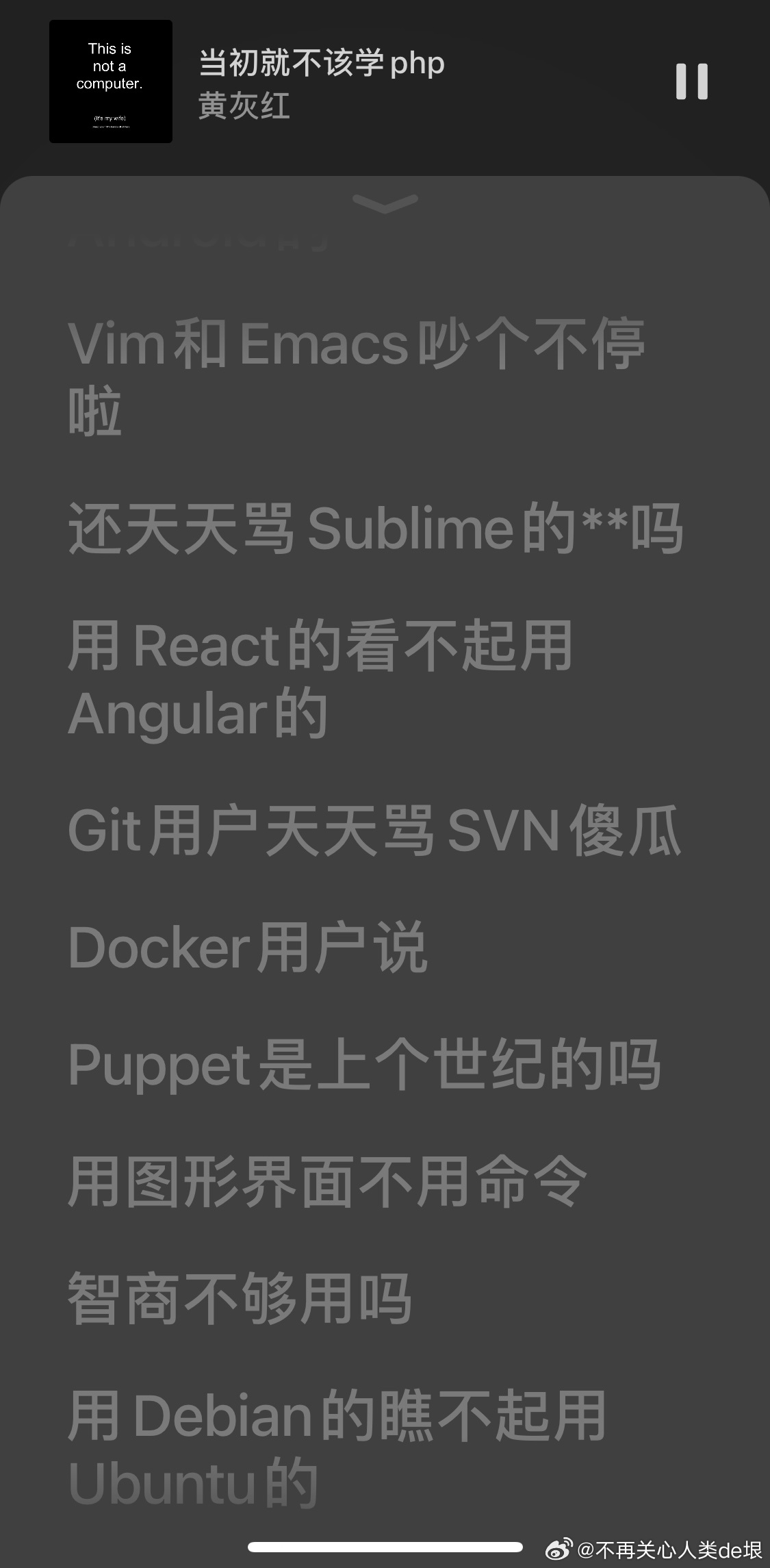 这就像我之前与一切被现代乒乓球文化洗脑的人,与 IT 业界的“黑客文化”决裂一样。我曾经在微信删除一个驻日本的华人乒乓球俱乐部里的所有人,因为他们的每一个都感觉如此的不对劲,就像被魔鬼驱动着,非得打这个球,非得争个名次一样。每一个都是如此的“好为人师”,似乎一个人的价值完全取决于他们如何看待你的乒乓球技术一样。经常自己都不懂,还觉得他们能指导别人。可笑不可笑,烦不烦?