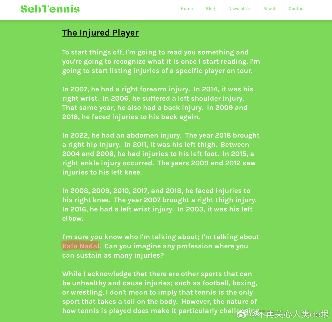 这样的比赛我根本没法看。费德勒也就少数早期的比赛好看点,其它的也跟纳达尔和德约差不多,来回对拉,直到一方犯低级错误。对于我来说,那根本不是在打球。三巨头都这样,近些年的其它选手就更不用提了。