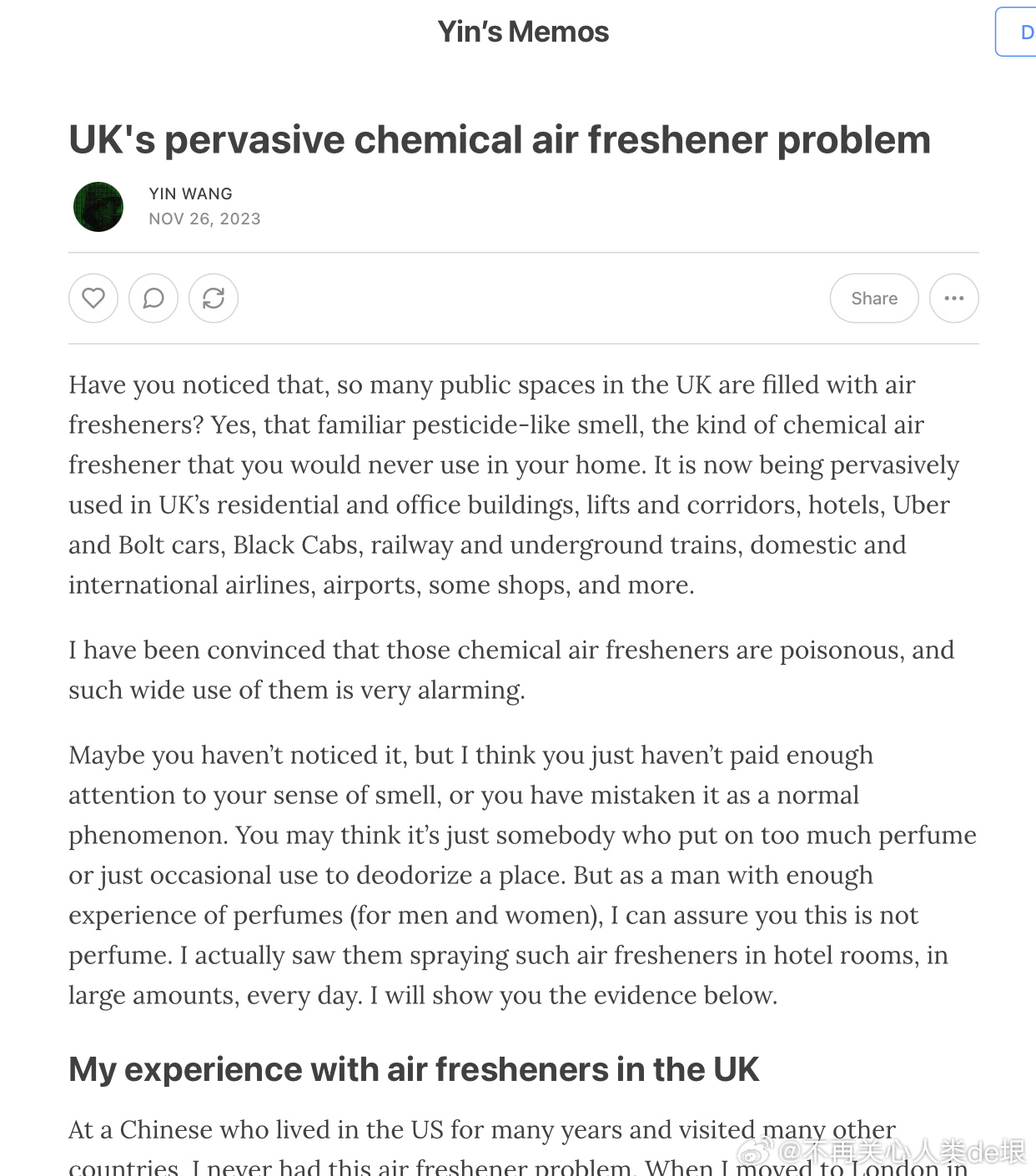 也许这就是为什么英国之类的国家能够实施这个计划,在公共场所充满了有毒空气清新剂。出租车,Uber,火车,飞机,酒店,机场,公寓楼…… 无所不在。我不知道这个情况最后是什么结局,但从英国人对这种不正常现象无动于衷的反应来看,人类的未来是非常堪忧的。
