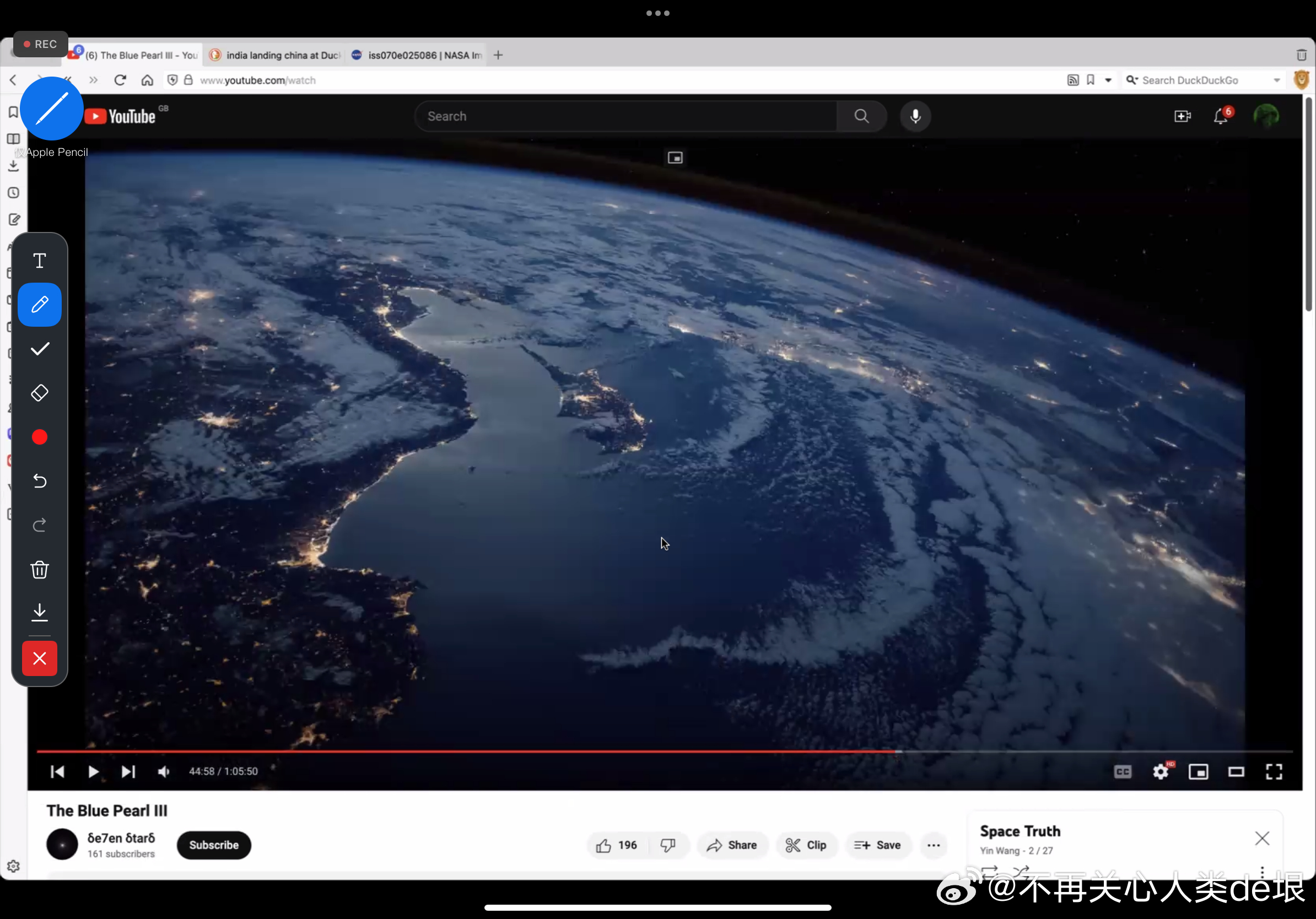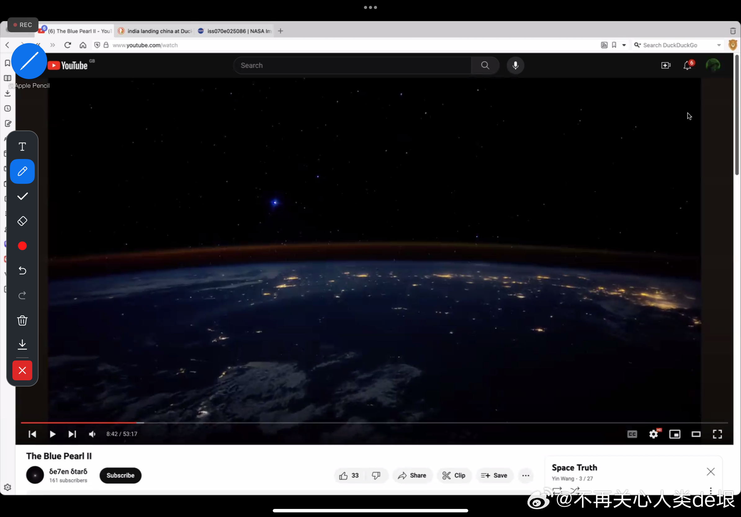 这个《The Blue Pearl》,我今天搜索 YouTube 的时候,发现已经只剩一个片源了。而之前我指出这个问题的时候是有好几个片源的,分了 I, II, III 三部曲。我觉得有人在想办法撤掉这个片子,这样人们就不能发现那些所谓“ISS 直播”放的都是这个电脑动画片。